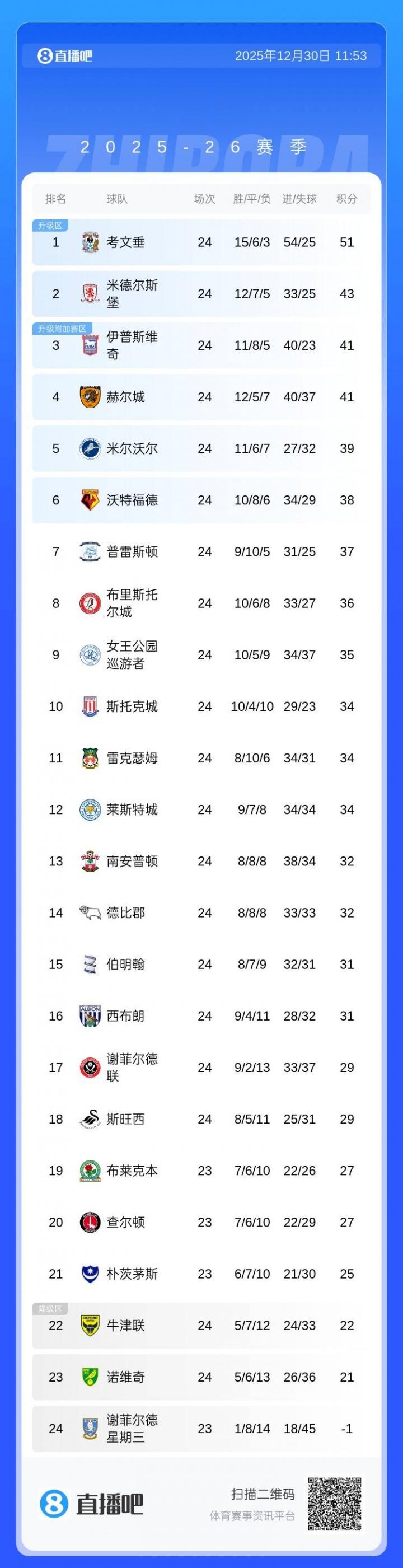 作为英冠的最强火力(24轮54球),考文垂两战伊普斯维奇,分别0-3和0-2输球,1个球也没进。不过,考文垂12月也只输了这两场比赛,他们依旧以8分领跑英冠,仍是升超最大热门球队。