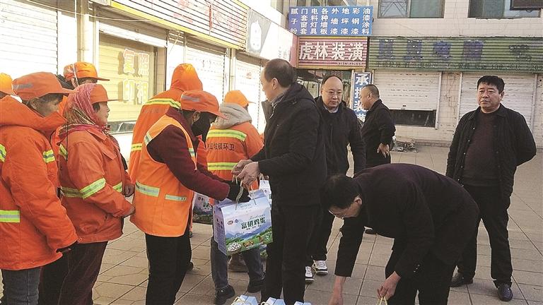 本报讯近日,交口县桃红坡镇天寒地冻,朔风凛冽,而位于步行街的定理文化广场却是欢声笑语,暖意融融。该镇康禽农场总经理、县政协委员王梁在此举行“冬日送温暖,情系环卫工”活动,现场将90箱富硒鸡蛋免费赠送全镇环卫工人,为冬日的街头增添一抹暖意。