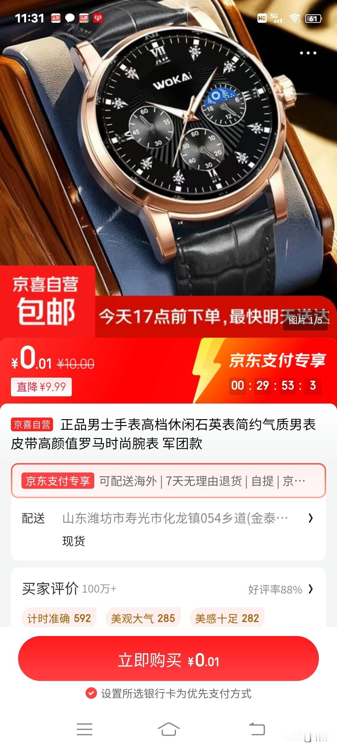 最近,头条收入很低,想刷广告挣俩金币试试。于是我刷到了这个0.01元的手表,听那里面说的那么真实,还说什么“你不薅这把羊毛,太可惜了”之类话,人穷志短,我决定试试,因为我也是京东的注册用户,于是我顺着广告一路点杀过去,果然有这个手表,而且还真是0.01元,于是我手起刀落,点了订单,但是在付款是,我看到他有新卡支付,还有微信支付,我连忙点了个微头支付,不料,它竟然跳出了个10.0元,原来这个表需要付10元钱,我突然觉得这个表就不是0.01元可以购买到,我一气之下取消了订单。 我们买东西经常听到别人说这个东多少钱起,总以为这个东西就是多少钱!比如说:这块手表是0.01元起,很多人以为这块手表是0.01元,其实后面的那个“起”很重要,它可以是10元,也可以是1000元,也可以是100000万元。。。。。。你如果认为那个起之前的数字是定价,你就大错特错了! 所以现在就有了一个通用的广告语:这个东西0.01元起。。。。。。