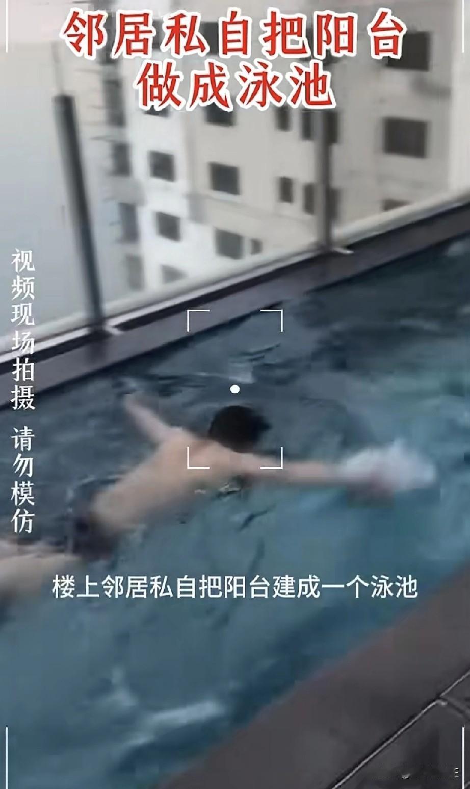 岂能恣意妄为? “阳台改成游泳池”! 这哥们真是牛啊,堪称网红改造。 不过话又说回来,这样做是不是存在很大的安全隐患? 荷载:1 m² 水重约 1 t,阳台改成泳池肯定是荷载严重超标。安全隐患太大了,还涉及防水,长期蓄水水压易渗到楼下。排水及抗震与耐久等问题。 房子原本没有“空中泳池”设计,把阳台改成游泳池,危害住房结构和邻居安全,一旦出现安全问题得不偿失呀!任性也要讲科学技术!