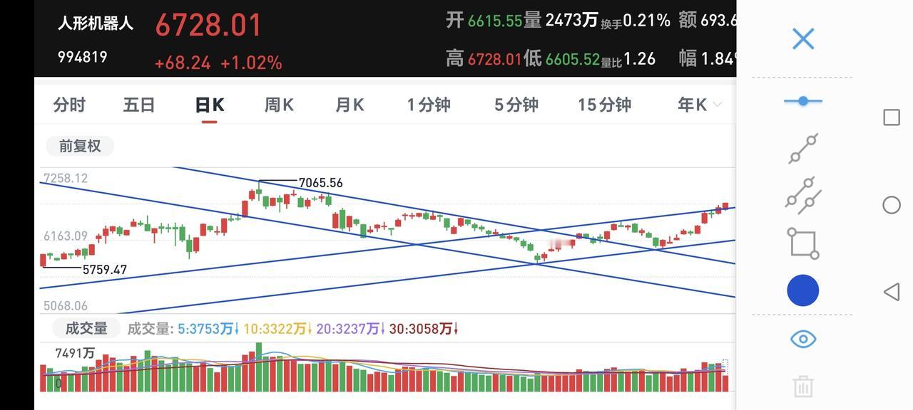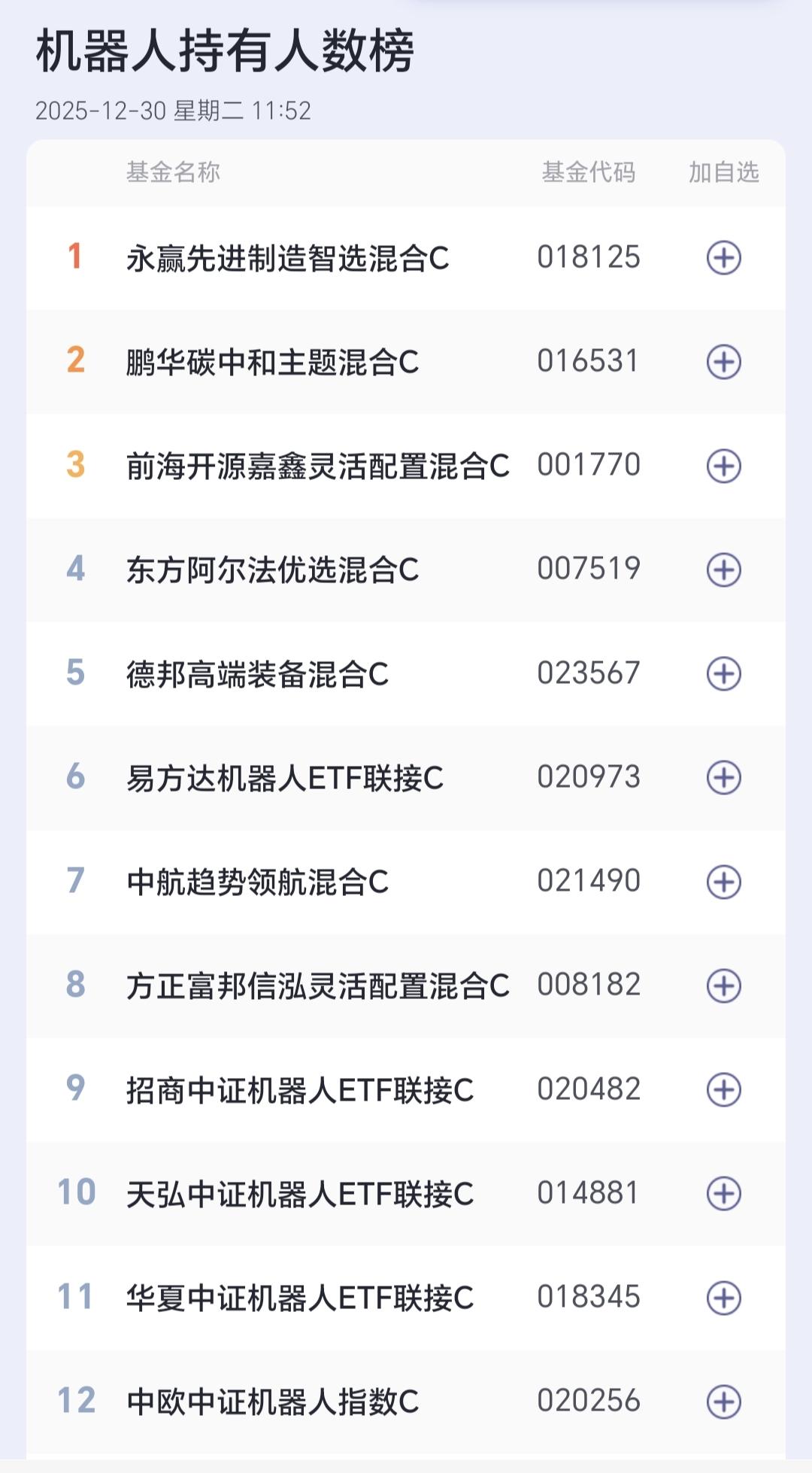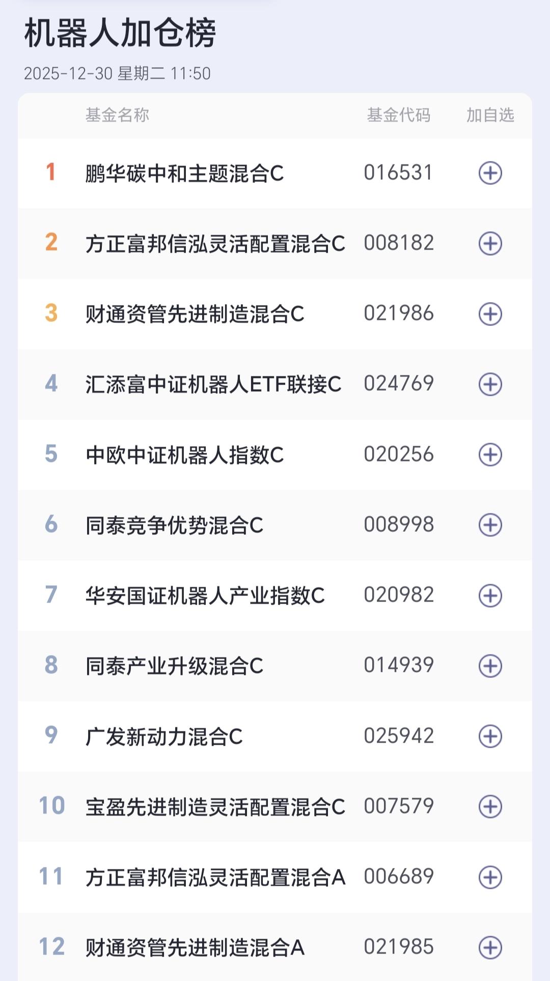基金:机器人板块大涨,什么时候考虑离场 机器人板块中午收盘之前直线大涨,现在是板块上涨幅度排名第一,上涨幅度排名前三位的是:机器人板块,有色金属板块,化工板块。 机器人板块现在盘中估值上涨了1.48%,是连续第五个交易日上涨,这个板块今天加仓排行榜见下面的截图3,持有人数排行榜见下面的截图4,加仓人数最多的是鹏华碳中和主题混合,持有人数最多的是永赢先进制造智选混合。 我们来看一下下面的截图5,这是机器人板块日K线图,从图中可以看出,我画了两条倾斜向上的斜线,这是机器人板块日线级别上涨通道,昨天上涨突破了这个上涨通道的上轨,收盘以后我说有可能会走加速走势,今天的上涨就说明了这个上涨加速在延续,在日线级别加速上涨的情况之下,持有的人可以继续持有,但追涨进场是不建议的。 我们来看一下下面的截图6,这是机器人板块周K线图,从图中可以看出,我画了两条倾斜向上的斜线,这是机器人板块周线级别上涨通道,现在的位置处于这个上涨通道中,也就是说,机器人板块周线级别处于上涨趋势中,持有的人可以继续持有,除非下跌跌破这个上涨通道的下轨,才可以考虑要不要止盈出来观望。 拿到热门板块,需要找好持有条件,这样才可以让自己的收益最大化,这样才可以最大的可能性保住自己的利润,如果你没有持有条件,在半途中随便抛出筹码,有可能会抛在半山腰,如果你没有持有条件在趋势改变的时候,你不抛出筹码,有可能会做一个过山车,让到手的利润回吐出去。 机器人板块的基金,短线持有条件是日线级别上涨通道的下轨,跌破这个上涨通道的下轨,就止盈出来观望,长线持有条件是周线级别上涨通道的下轨,跌破这个上涨通道的下轨,就止盈出来观望。 只要不跌破日线级别和周线级别上涨通道的下轨,就随便它的涨跌,就无视它的涨跌,有了这样的持有条件以后,你会很淡定,你就不会见到涨了就问要不要进场,你更不会见到低了就问要不要离场。 我每天都会分享我的观点,我的观点只代表我个人的看法,不能作为你操作的依据,据此操作后果自负。