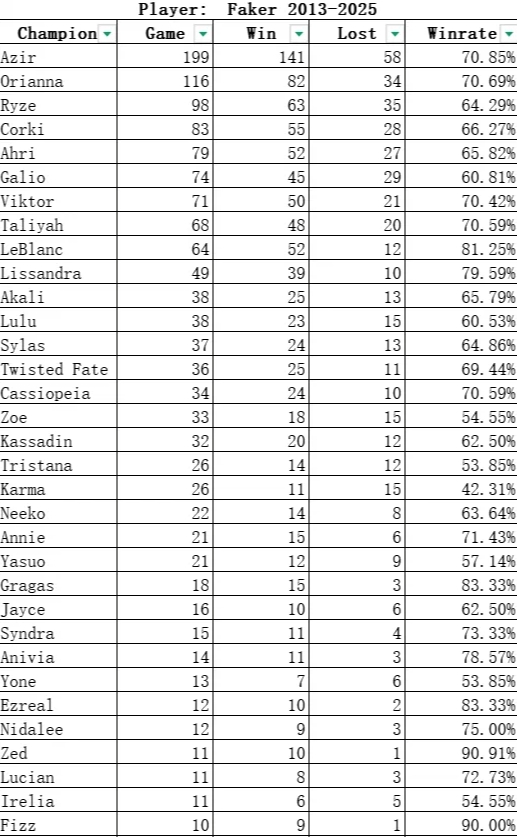 不愧是沙皇本皇!Faker截至2025年全部正式比赛英雄出场数据:沙皇生涯胜率70.85%!