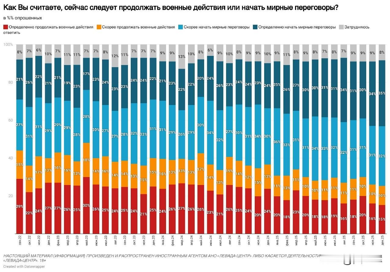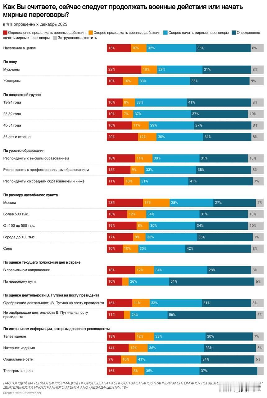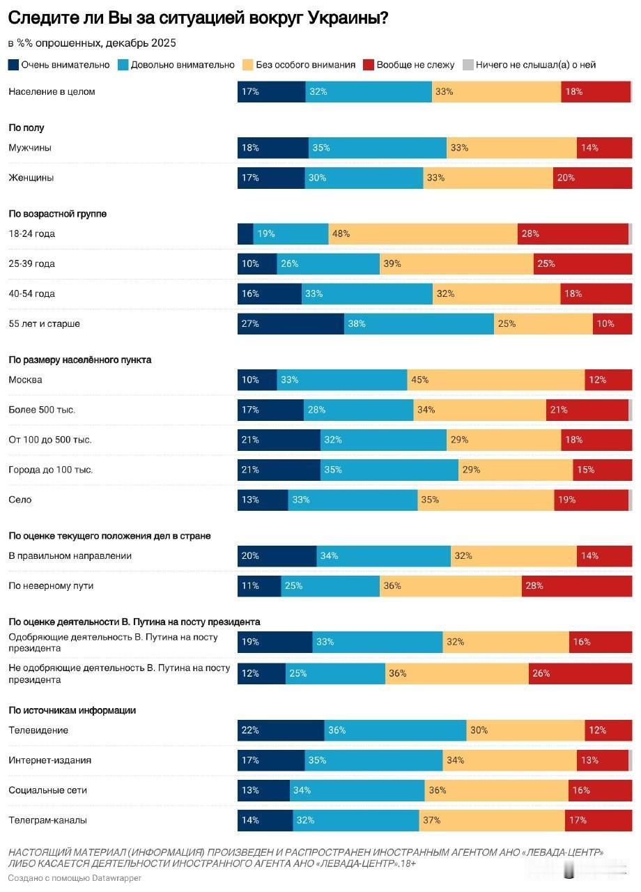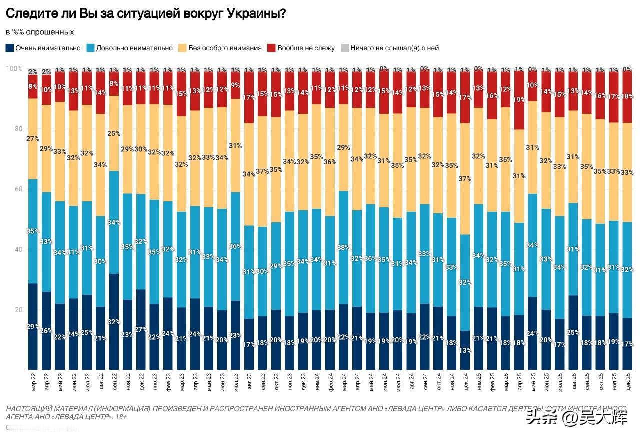 【列瓦达2025年12月关于俄乌冲突的民调:俄军支持率、和谈意愿及对美国和平计划的看法】 -- 12月,约半数受访者(49%)会较为密切地关注俄乌冲突相关局势,三分之一受访者(33%)仅作一般性关注,18%的受访者表示不关注此事。 -- 俄罗斯民众对俄军行动的支持率仍处高位,达73%(相较于2025年5月下降7个百分点);不支持俄军行动的受访者占比为18%(相较于2025年5月上升5个百分点)。 -- 三分之二的受访者支持启动和平谈判(支持率66%,与今年8月的峰值持平),而支持继续开展军事行动的受访者占比降至四分之一(25%),创下冲突爆发以来的最低纪录。 -- 半数受访者(51%)不相信美国推动的和平协议谈判能够取得成功,仅有略超四分之一的受访者(28%)持相反观点。