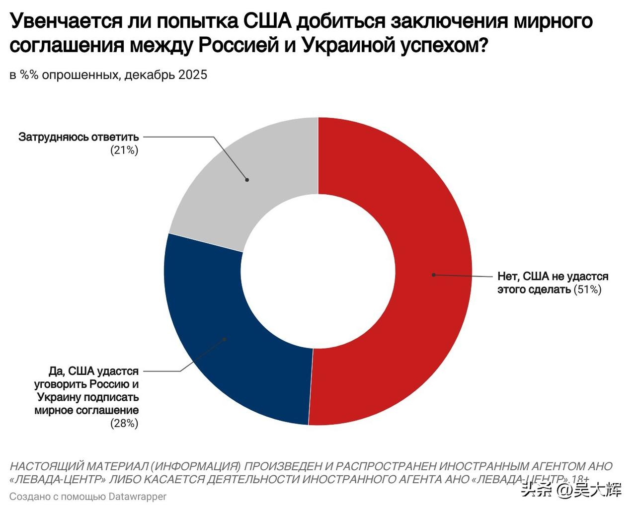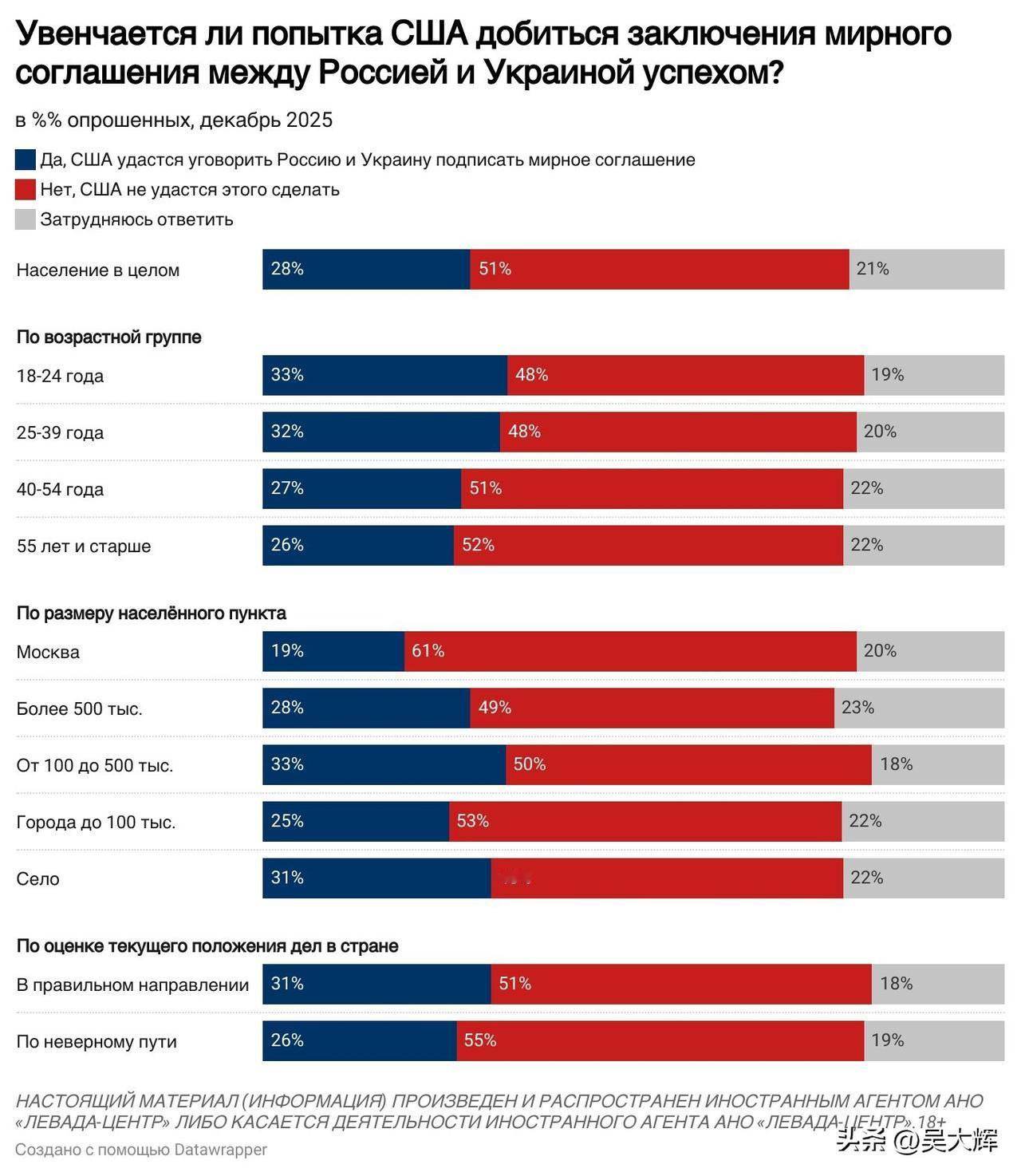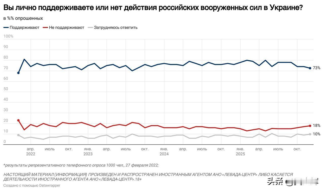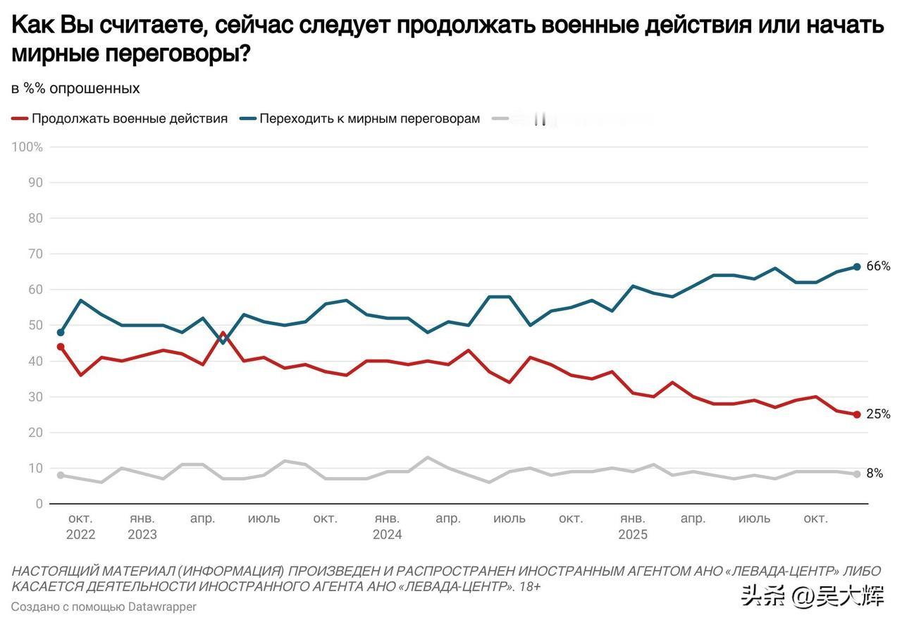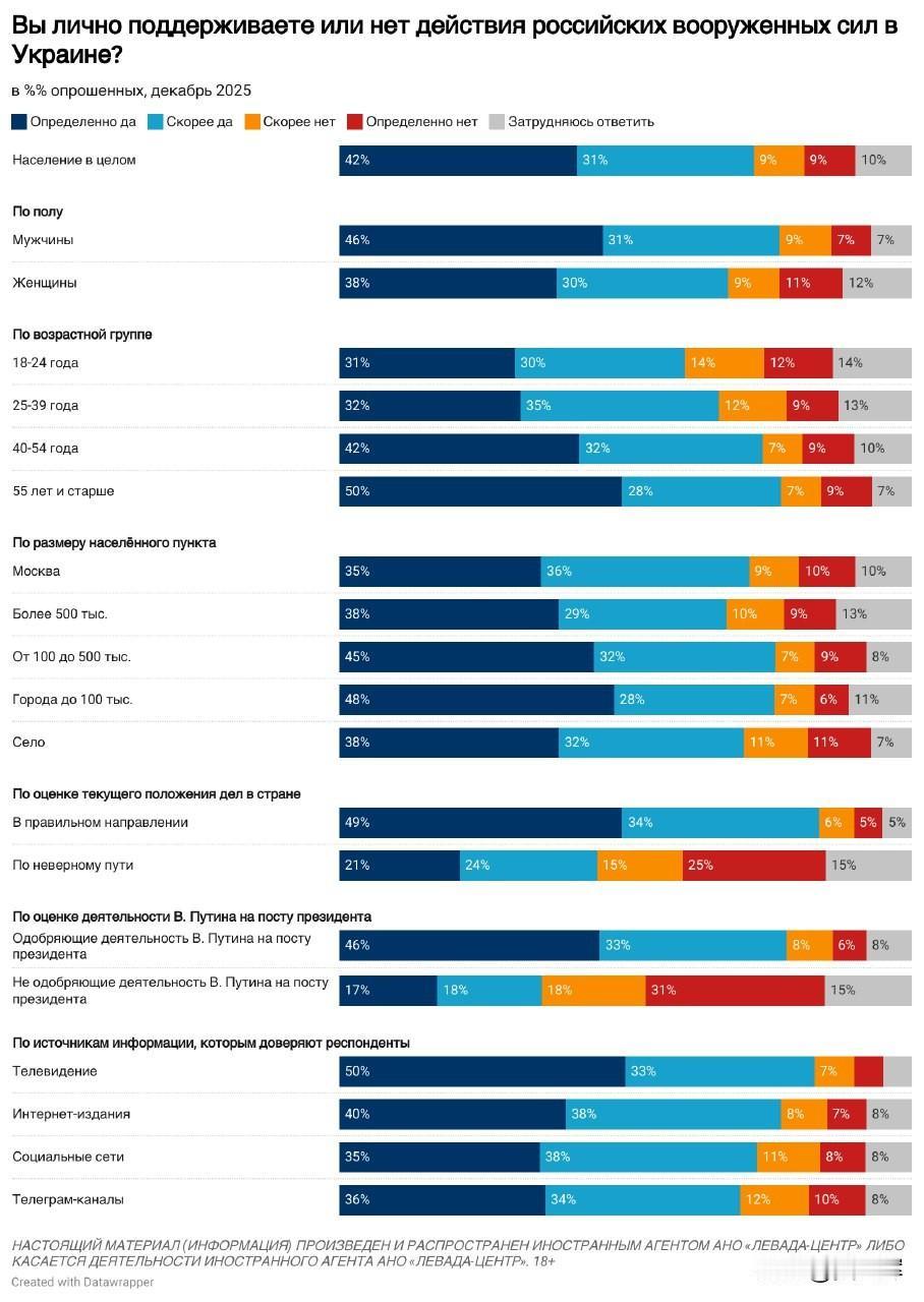 【列瓦达2025年12月关于俄乌冲突的民调:俄军支持率、和谈意愿及对美国和平计划的看法】 -- 12月,约半数受访者(49%)会较为密切地关注俄乌冲突相关局势,三分之一受访者(33%)仅作一般性关注,18%的受访者表示不关注此事。 -- 俄罗斯民众对俄军行动的支持率仍处高位,达73%(相较于2025年5月下降7个百分点);不支持俄军行动的受访者占比为18%(相较于2025年5月上升5个百分点)。 -- 三分之二的受访者支持启动和平谈判(支持率66%,与今年8月的峰值持平),而支持继续开展军事行动的受访者占比降至四分之一(25%),创下冲突爆发以来的最低纪录。 -- 半数受访者(51%)不相信美国推动的和平协议谈判能够取得成功,仅有略超四分之一的受访者(28%)持相反观点。