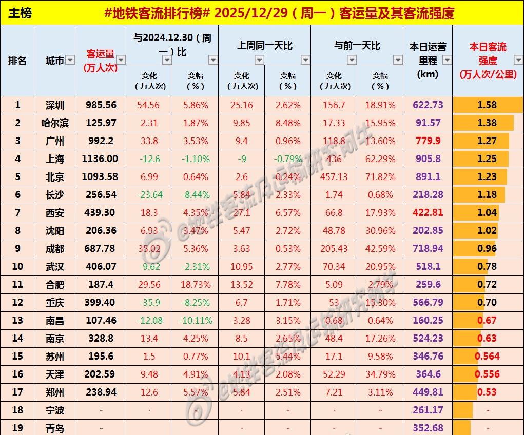 【中国城市地铁客流排行榜 2025-12-29(周一,农历冬月初十,中国地铁客流日报】 主榜风云:19城争霸,沪深双榜!