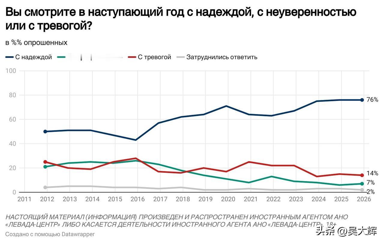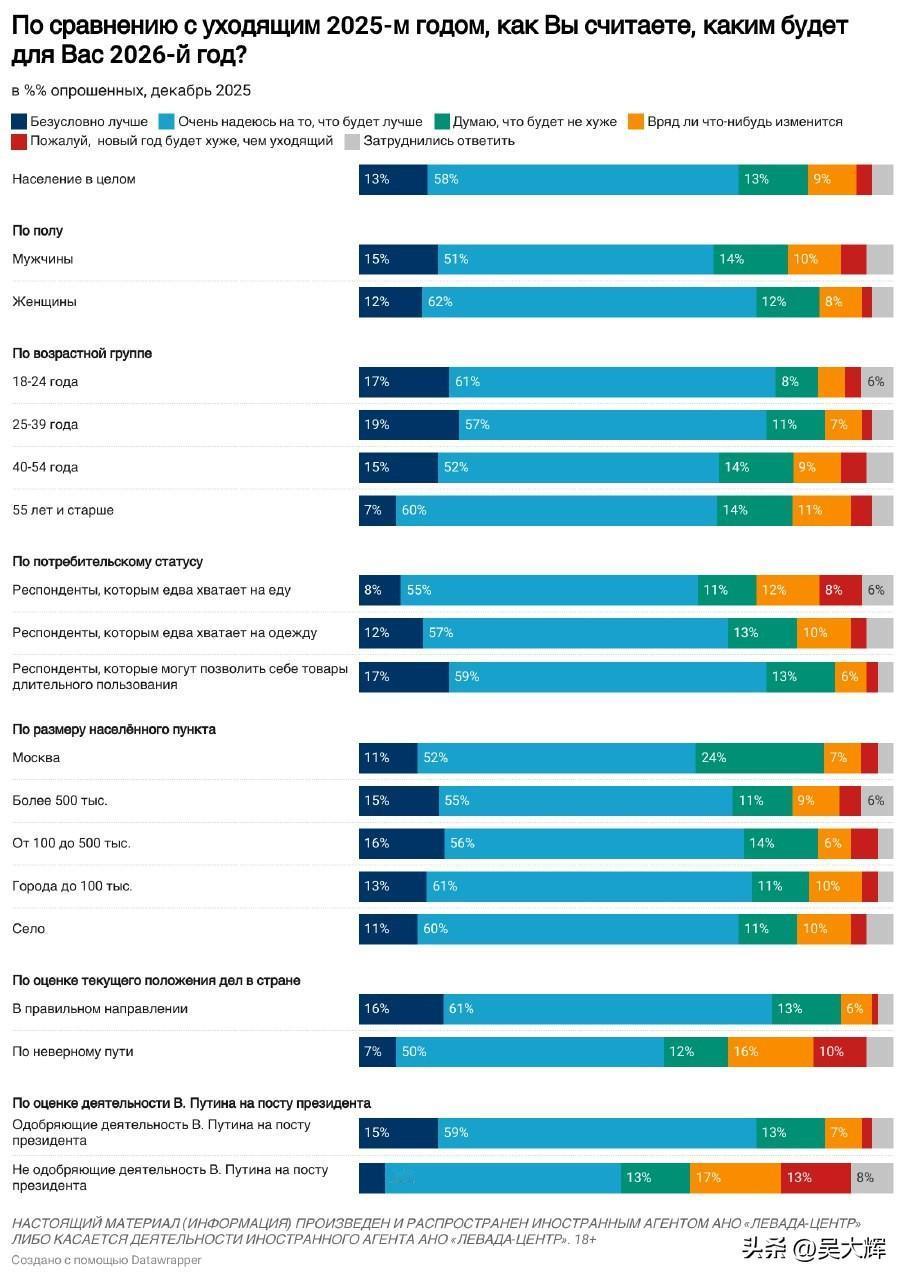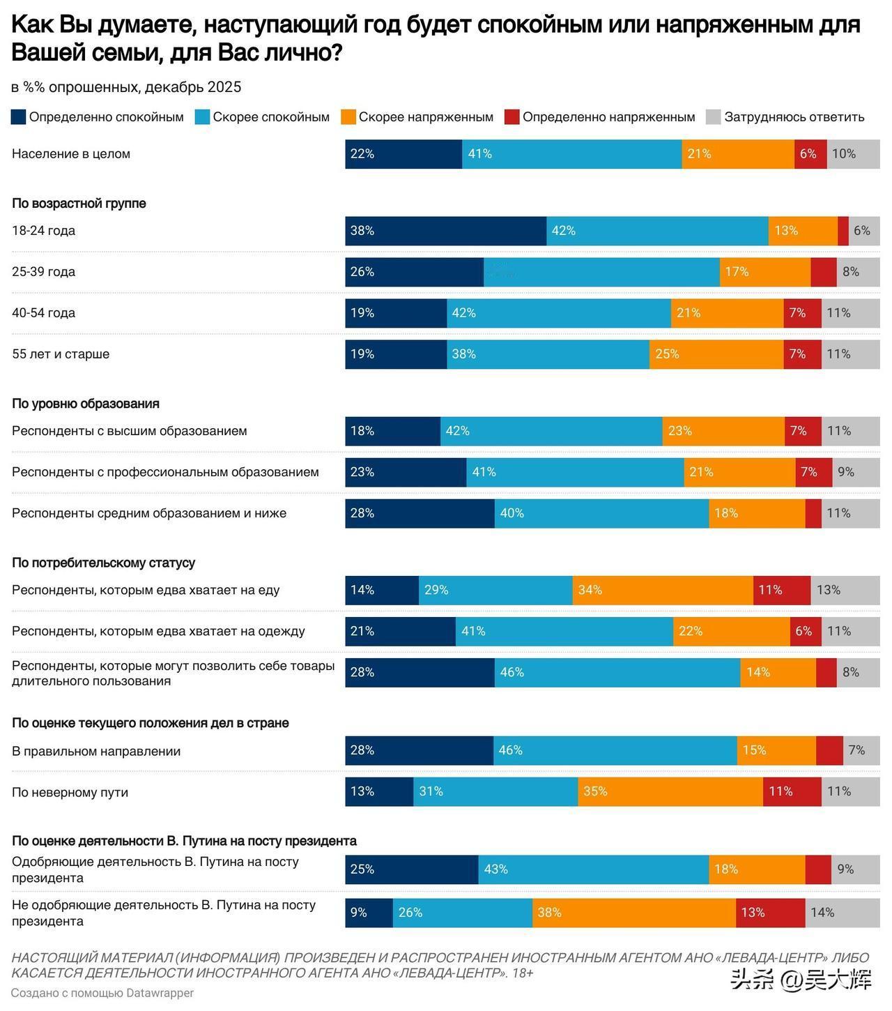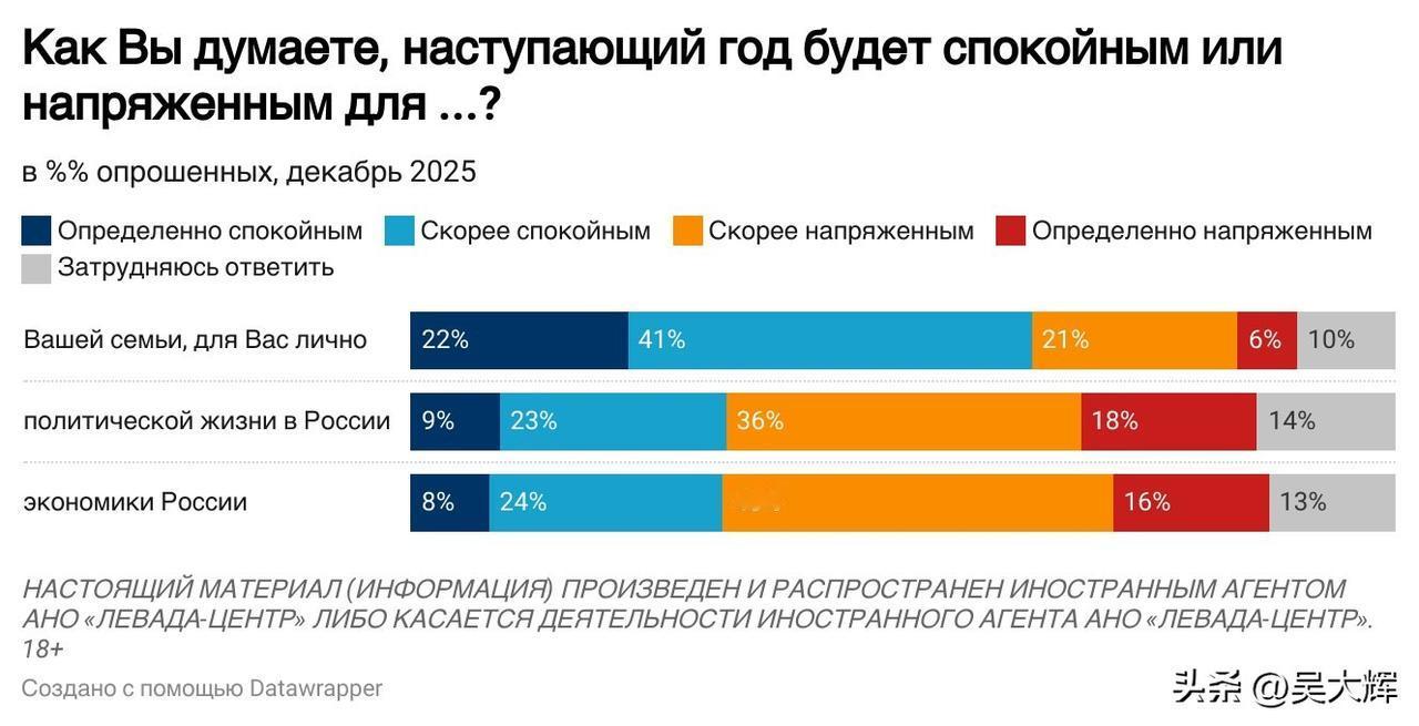 【列瓦达关于俄民众新年期待的民调:民众的愿望、个人境况预判及对国家经济与政治形势的看法】 -- 大多数受访者(71%)希望2026年会比上一年更好;13%的受访者认为新的一年不会比即将过去的年份更差;9%的受访者觉得来年大概率不会有什么变化;仅有3%的受访者认为2026年会比今年更糟。 -- 四分之三的受访者(76%)满怀希望地迎接新一年的到来,这一比例创下了该民调开展以来的最高纪录(较2015年上升33个百分点),不过近三年来该数据的增长态势已基本停滞;14%的受访者对新的一年心怀忧虑;7%的受访者则态度迷茫。 -- 约三分之二的受访者(63%)认为新的一年自己的个人生活将会平稳顺遂;但仅有三分之一的受访者(32%)觉得国家的经济与政治局势会保持稳定。民众对新一年的积极预期在过去三年间呈稳步上升趋势。