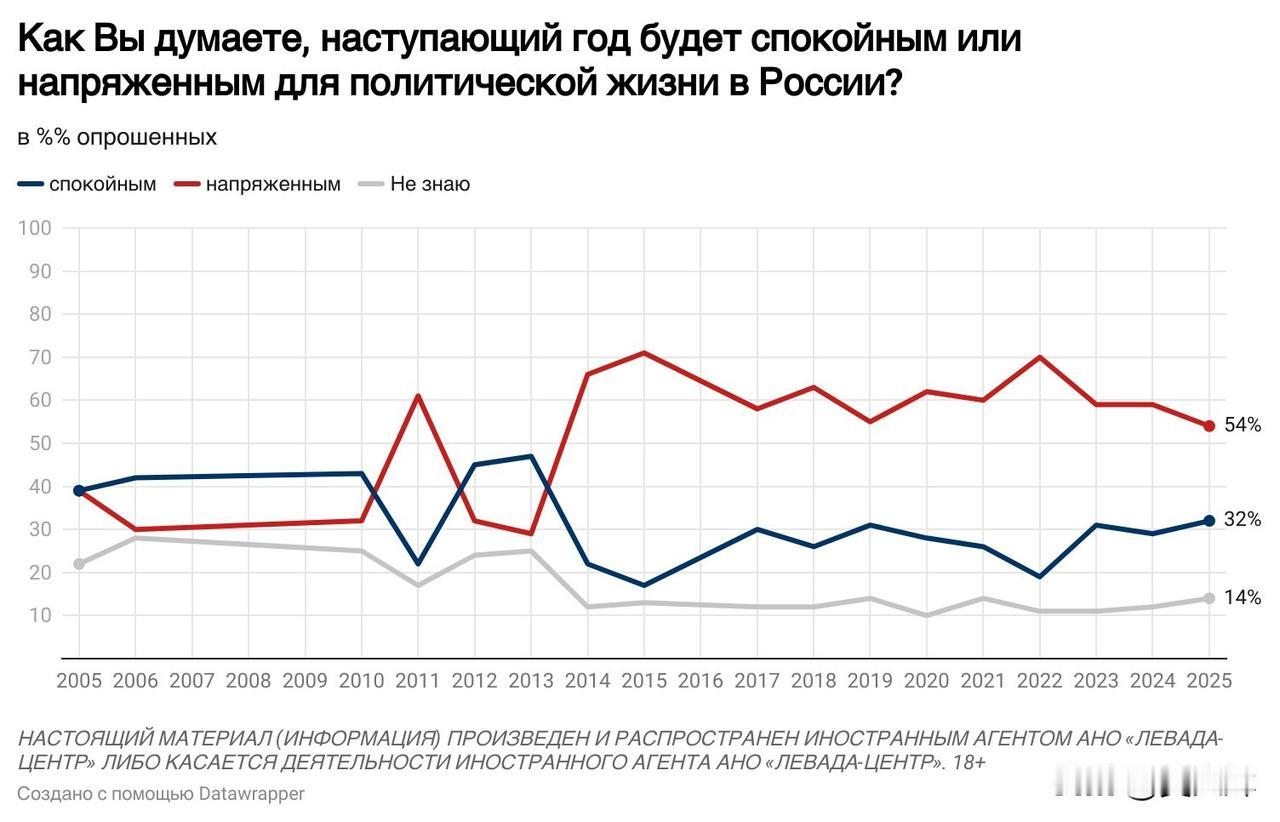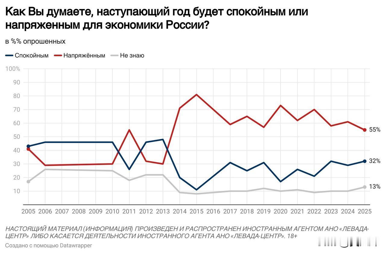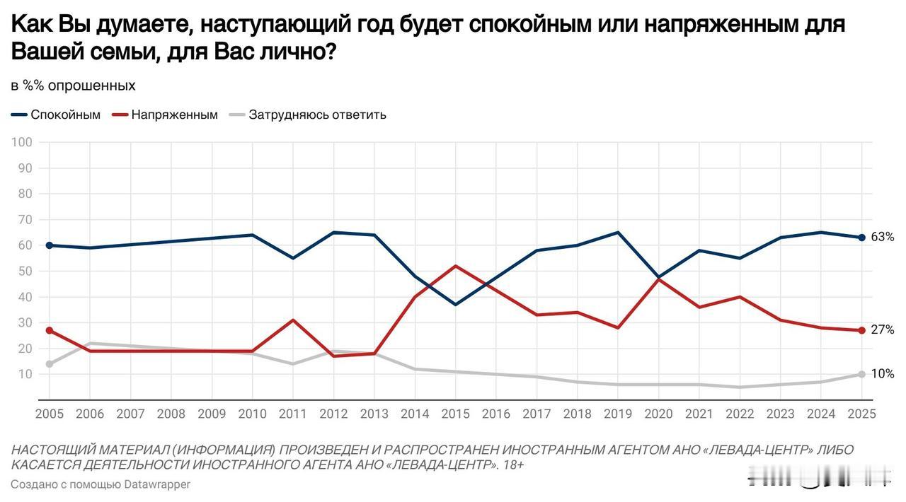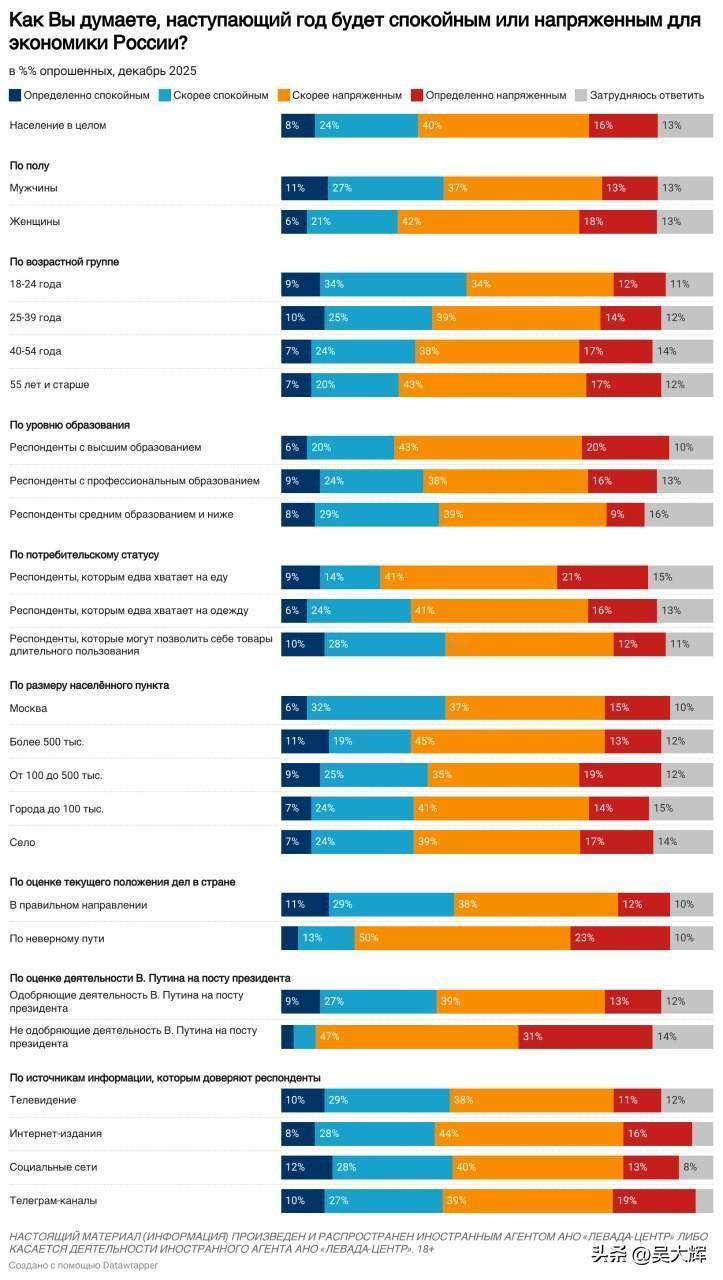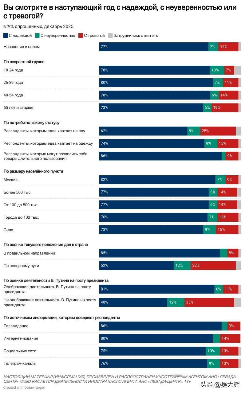 【列瓦达关于俄民众新年期待的民调:民众的愿望、个人境况预判及对国家经济与政治形势的看法】 -- 大多数受访者(71%)希望2026年会比上一年更好;13%的受访者认为新的一年不会比即将过去的年份更差;9%的受访者觉得来年大概率不会有什么变化;仅有3%的受访者认为2026年会比今年更糟。 -- 四分之三的受访者(76%)满怀希望地迎接新一年的到来,这一比例创下了该民调开展以来的最高纪录(较2015年上升33个百分点),不过近三年来该数据的增长态势已基本停滞;14%的受访者对新的一年心怀忧虑;7%的受访者则态度迷茫。 -- 约三分之二的受访者(63%)认为新的一年自己的个人生活将会平稳顺遂;但仅有三分之一的受访者(32%)觉得国家的经济与政治局势会保持稳定。民众对新一年的积极预期在过去三年间呈稳步上升趋势。