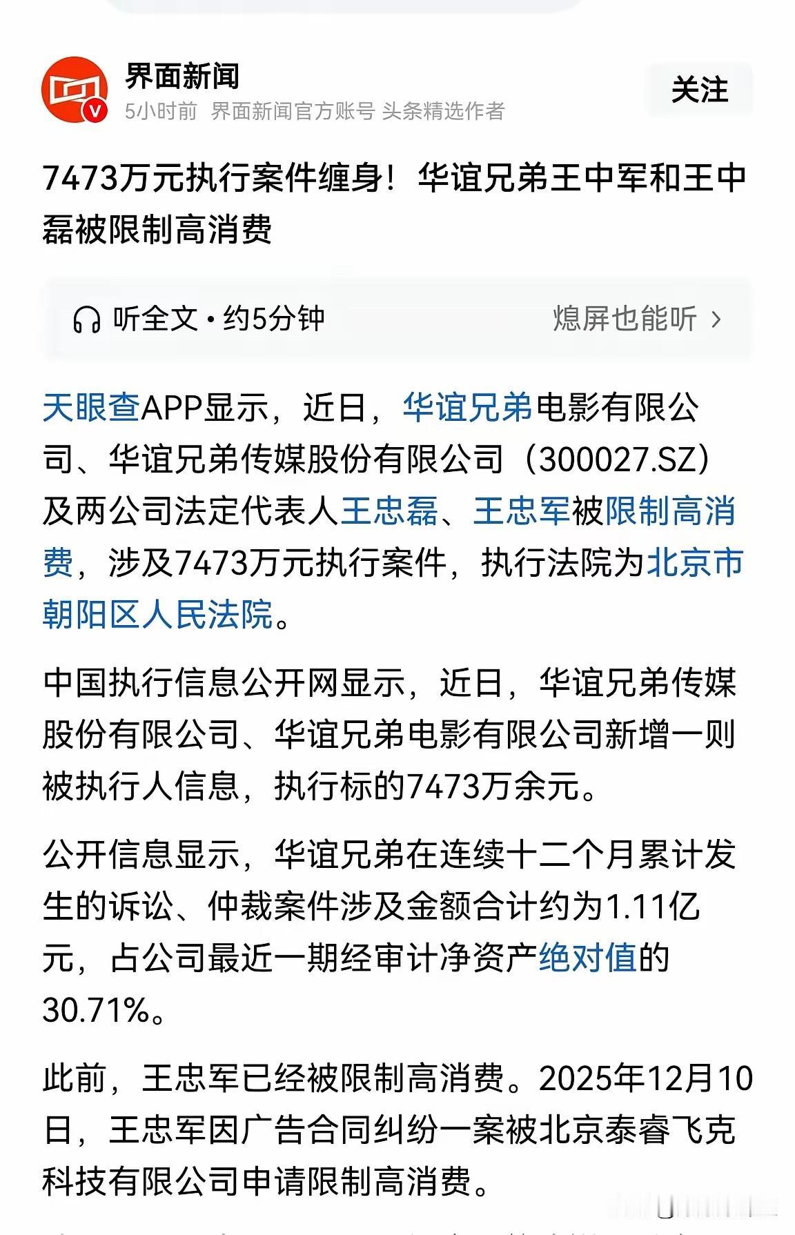 这回是真栽跟头了,那个搞传媒的大佬王中军,因为7473万的案子成了被执行人,连高消费都被限制了。 想起当年那一出我就来气,给苏州捐个老子雕像,做得奇丑无比,那是艺术吗?那是赤裸裸的埋汰人!那时候多狂啊,现在没钱了想起大家伙儿来了? 听说这哥俩的公司还指望后面几部新电影翻身呢。 我觉得咱们普通老百姓虽然没啥大本事,但手里这张电影票钱还是能做主的。 千万别记吃不记打,人家那时候怎么羞辱咱们文化的,现在想靠咱们回血?门儿都没有。 这种一边吃饭一边砸锅的人,就该让他凉透。别到时候电影一上,又有人凑热闹去送钱,那可真是太没骨气了。