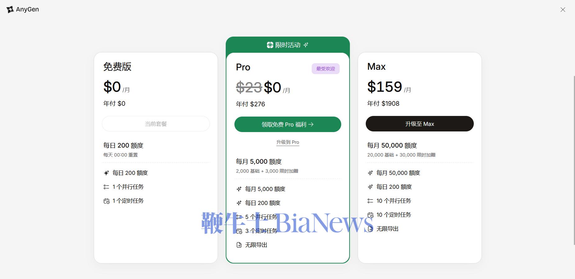 在使用机制上,AnyGen采用积分制计量任务消耗,并设置免费版、Pro版、Max版三层会员体系,不同等级会员在任务权限、导出功能等权益上形成梯度差异,满足不同用户的使用需求。
