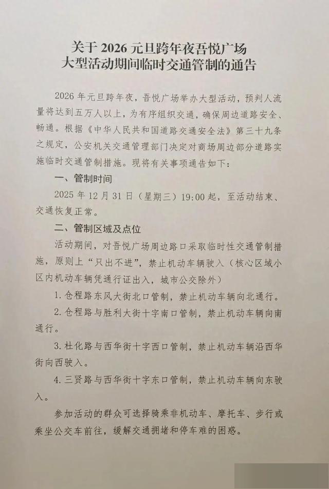 2026年元旦跨年夜,吾悦广场举办大型活动,预判人流量将达到五万人以上,为有序组织交通,确保周边道路安全、畅通。根据《中华人民共和国道路交通安全法》第三十九条之规定,公安机关交通管理部门决定对商场周边部分道路实施临时交通管制措施。现将有关事项通告如下: