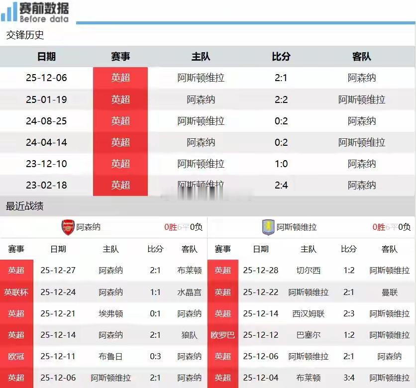 阿森纳vs维拉前瞻:阿森纳锋无力 主场复仇难度大 维拉连胜也难北京时间12月31日凌晨04:15,英超第19轮迎来前三大战,也是复仇之战,阿森纳主场迎战阿斯顿维拉。阿森纳vs阿斯顿维拉,比赛看点如下:第一:两队情况!英超18轮战罢,阿森纳13胜3平2负积42分排名第一,阿斯顿维拉13胜1平4负积39分排名第三,两队仅差3分。上轮英超,阿森纳主场2-1击败布莱顿,取得联赛三连胜;阿斯顿维拉客场2-1逆转击败切尔西,各项赛事豪取11连胜,追平队史111年连胜纪录,英超近13轮取12胜。第二:阿森纳锋无力,主场复仇难度大,维拉连胜也难!阿森纳最近的比赛全是靠乌龙球或者点球取胜对手,暴露了球队锋无力的顽疾,新援中锋约克雷斯从葡超到英超,能力略显不足,热苏斯伤愈复出,体能不是很好,感觉跑不动;萨卡近期状态也不好,阿森纳的锋线确实有点弱。好在中卫加布里埃尔伤愈复出,这不仅增加了阿森纳后防线的稳定性,以及定位球的争顶能力。阿斯顿维拉后半场惹不起,此役客战领头羊阿森纳肯定是反击战,埃梅里面对旧主,算是知己知彼。若阿斯顿维拉客场稳守反击,阿森纳主场攻坚战难度很大,阿斯顿维拉可以选择打消耗战,到了下半场再发起冲击。阿森纳渴望主场击败阿斯顿维拉完成复仇,而阿斯顿维拉渴望打破队史111年的连胜纪录,但难度都很大,或许一场平局是可能存在和接受的。阿尔特塔不爱轮换,强强对话略显保守,这也是平局可能生成的因素。双方近6次交手,阿森纳2胜1平3负,处于下风。双方伤停情况:阿森纳有哈弗茨(疑)、卡拉菲奥里(疑)、莫斯克拉、本-怀特、道曼;阿斯顿维拉有卡马拉、卡什、巴克利、明斯、托雷斯。
