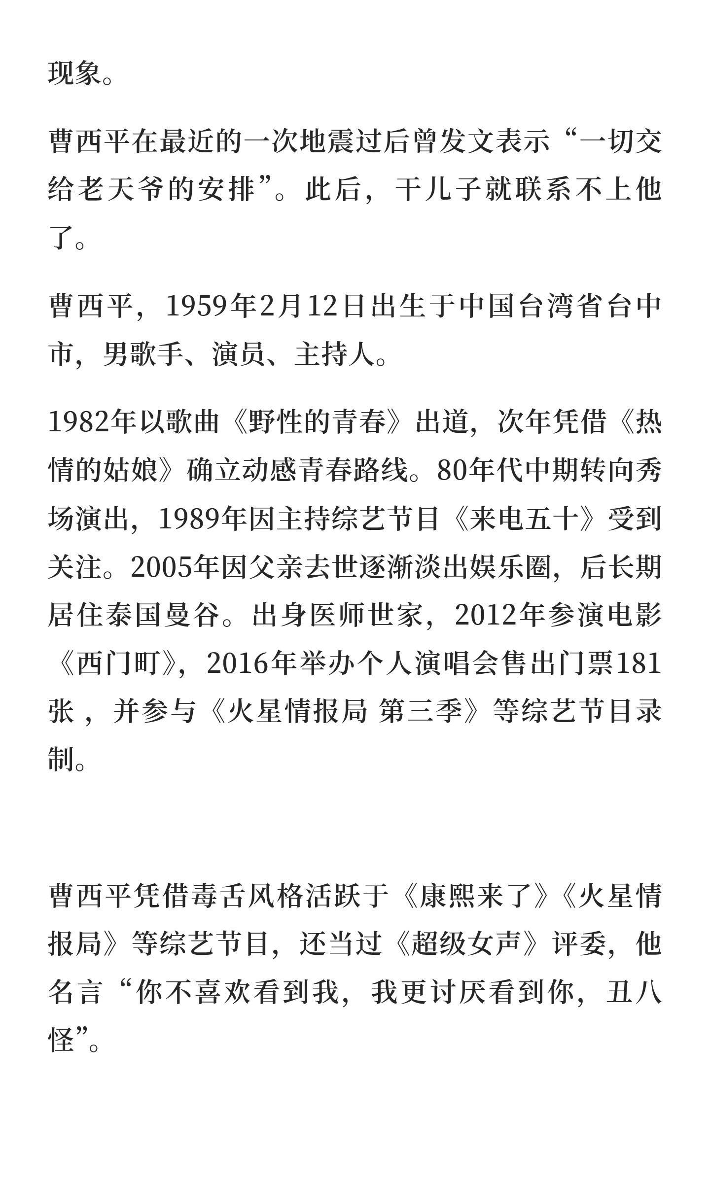 台湾资深艺人突然去世,《康熙来了》的熟人知名艺人曹西平于29日去世,享年66岁。他曾以《野性的青春》出道,活跃于音乐、综艺等领域,以毒舌风格活跃于《康熙来了》等节目。