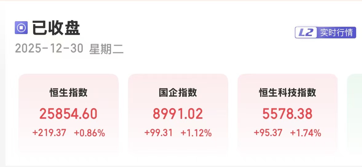 上证报中国证券网讯(卢伊记者严晓菲)12月30日,港股三大指数集体收涨。截至收盘,恒生指数涨0.86%,报25854.60点;恒生国企指数涨1.12%,报8991.02点;恒生科技指数涨1.74%,报5578.38点。