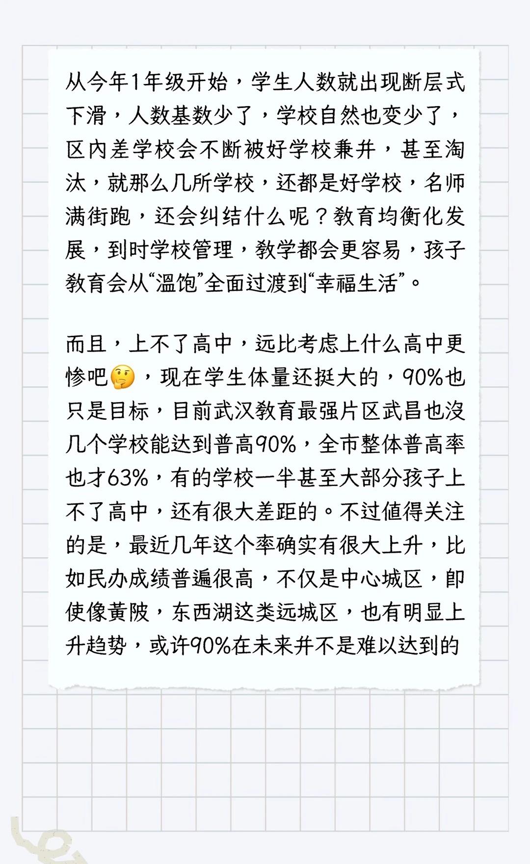 武汉普高率都到90%,我的孩子还有书读吗❓ 最近在网上看了一篇很有意思的帖子,未来湖北的普高率要向90%看齐,代表着人人都能上高中。本来是好消息,家长却意料之外的焦虑起来。“有那么多学位吗?是不是增加的都是差高中的学位,好高中是不是越来越难?我的孩子会有什么书读? 其实不用那么焦虑了[机智] 从今年1年级开始,学生人数就出现断层式下滑,人数基数少了,学校自然也变少了,区内差学校会不断被好学校兼并,甚至淘汰,就那么几所学校,还都是好学校,好老师满街跑,还会纠结什么呢?教育均衡化发展,到时学校管理,教学都会更容易,孩子教育会从“温饱”全面过渡到“幸福生活”,有更高水准。 而且,上不了高中,远比考虑上什么高中更惨吧🤔,说句不好听的,有的家长觉得能上高中就不错了[偷笑],现在学生体量还挺大的,90%也只是目标,比如武汉教育最强片区武昌也没几个学校能达到普高90%,全市整体普高率也才63%,有的学校一半甚至大部分孩子上不了高中,还是有很大差距的。但是发现最近几年这个率确实有很大上升,比如民办成绩普遍很高,不仅是中心城区,即使像黄陂,东西湖这类远城区,也有明显上升的趋势,或许90%在未来并不是难以达到的。 武汉升学 中小学 名校 孩子的起跑线 高考不是唯一出路 教育风向标 武汉择校 孩子教育 家长 中考