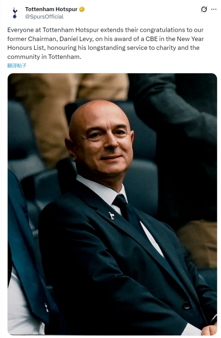 前热刺主席列维将被授予CBE勋章,俱乐部官方社媒发文祝贺