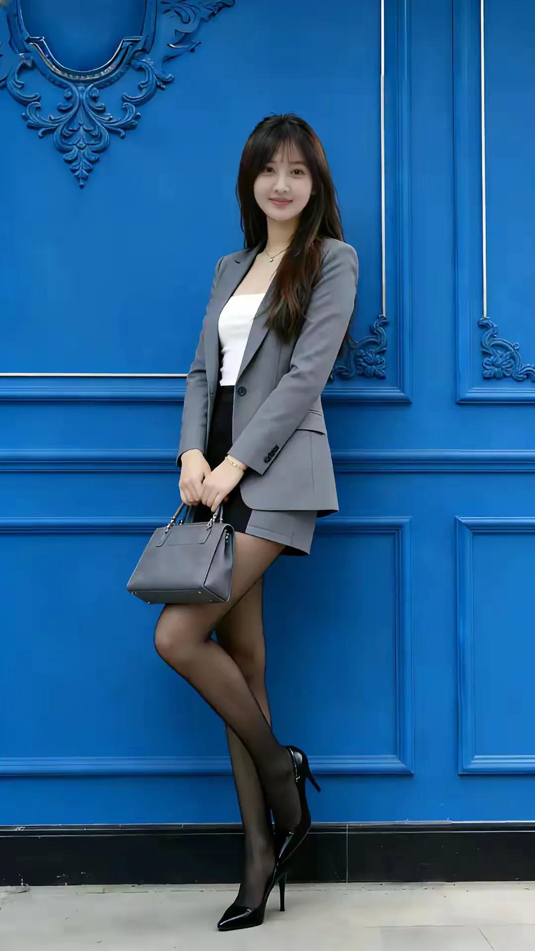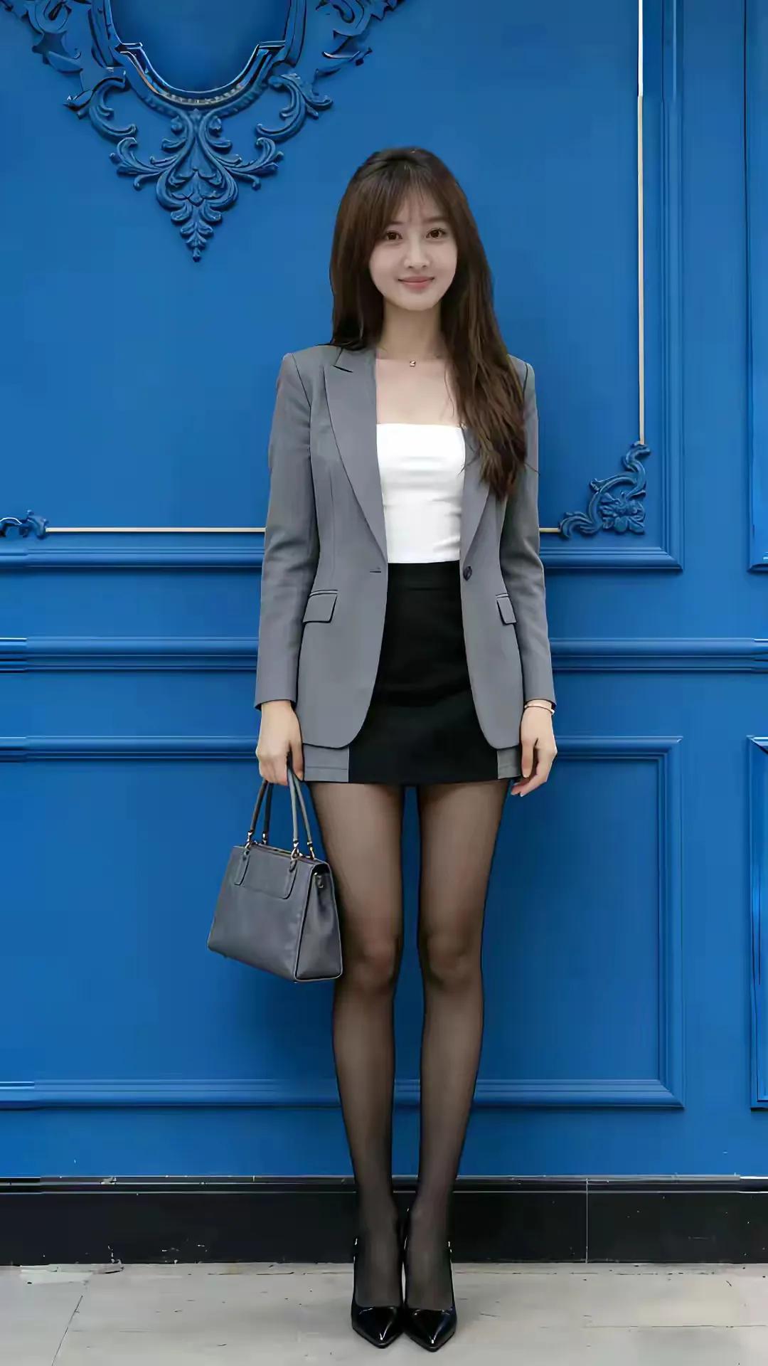 优雅职场风,灰色西装搭配黑色短裙,手提包尽显时尚感!