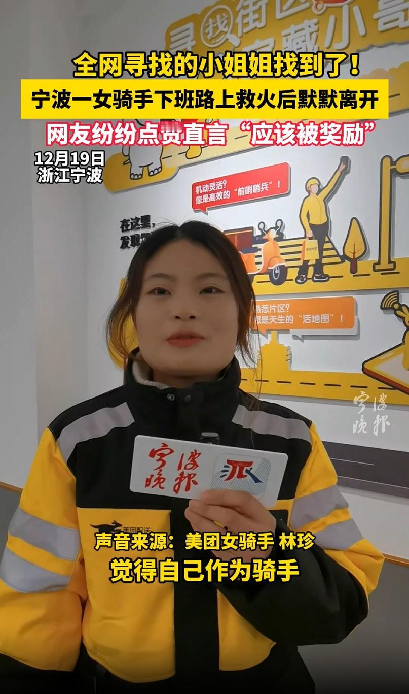 路口忽然窜起的火把人群逼退,电瓶车整辆被吞没。 我正停在一旁,还在犹豫该怎么帮,一位女骑手已经转身去拿灭火器了。 那是12月4日晚近十点,宁南南路与三池路交叉口。 她刚送完当天最后一单准备下班,第一次遇到这种火,明显也紧张,但动作很利落。 她提醒大家退到安全距离,冲回不远处的站点,抱来灭火器压住火势,再跑回去取第二个灭火器,前后大概十分钟,把火彻底扑灭。 火光散去,她没留下名字,也没多停留,默默离开。 后来站点检查才发现灭火器用完了,大家这才知道有人在关键时刻出手了。 网上很快有人发布了现场视频,全城寻找这位女骑手。 几天后,她被找到,叫林珍,28岁,来自江西,上个月才和丈夫一起在美团环球银泰站开始跑单。 她入职时接受过消防培训,那晚的果断与镇定就有了底气。 12月19日,在刚刚启用的浙江首家骑手之家中心店,美团为她颁发先锋骑手荣誉称号,送上锦旗和奖励金。 这份公开的肯定,为她的勇敢加上了温暖的注脚,也让我们这些目击者觉得这座城市更值得托付。 那晚的画面很简单:一团火,一群后退的路人,一个小小的身影来回奔跑,两只灭火器压住危险。 她不是不怕,只是选择向前;平台不是旁观,而是及时认定与嘉奖。 向林珍致敬,也为美团的回应点个赞。 愿每一次举手之劳都能被看见,每一次勇敢都有力量接住。