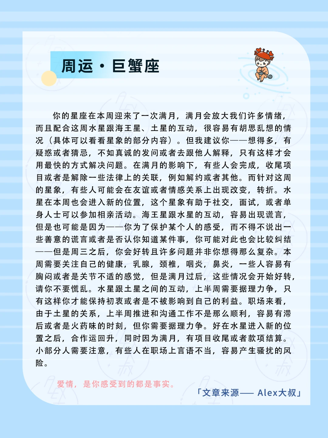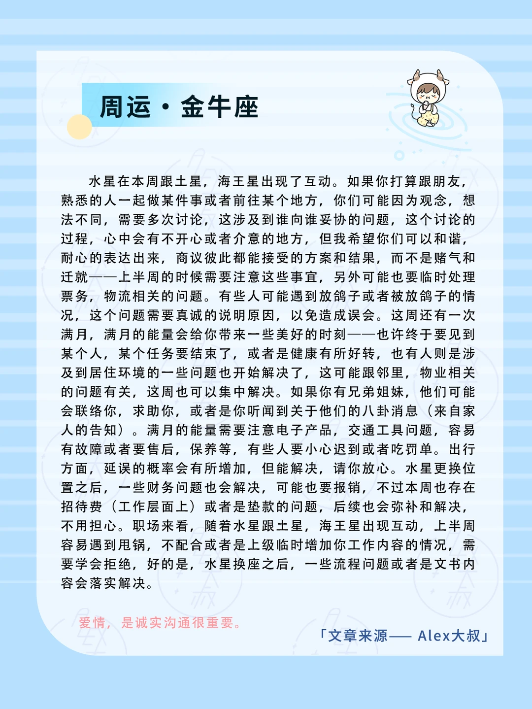 水星跟海王星出现了互动,不过这个星象也是对抗星象——本周的星象其实都较为激烈,这可能导致自己很敏感,很容易过度分析、在意他人的行为和言论,又或者是自己胡思乱想,想要弄清楚别人“为什么会这样”又或者是“到底对自己是什么态度和观感”等问题,如果你出现了这种情况——你已经被对方影响到了,但是你需要学会课题分离,而不是在此时因为他人而影响到自己的节奏和生活、工作计划。