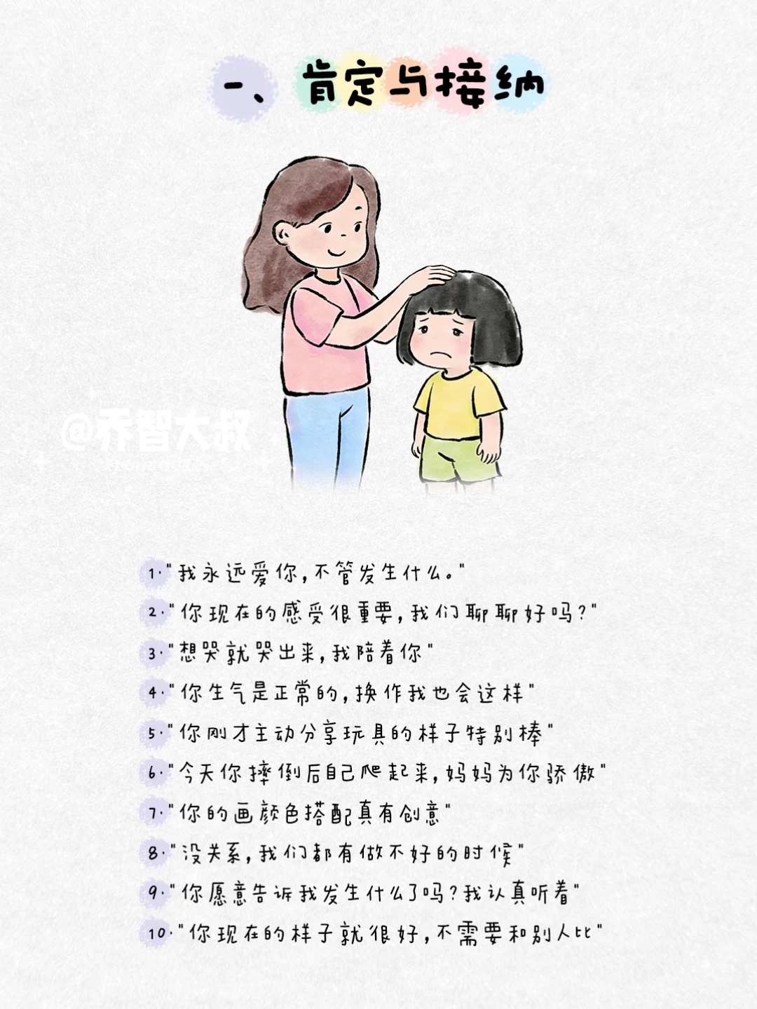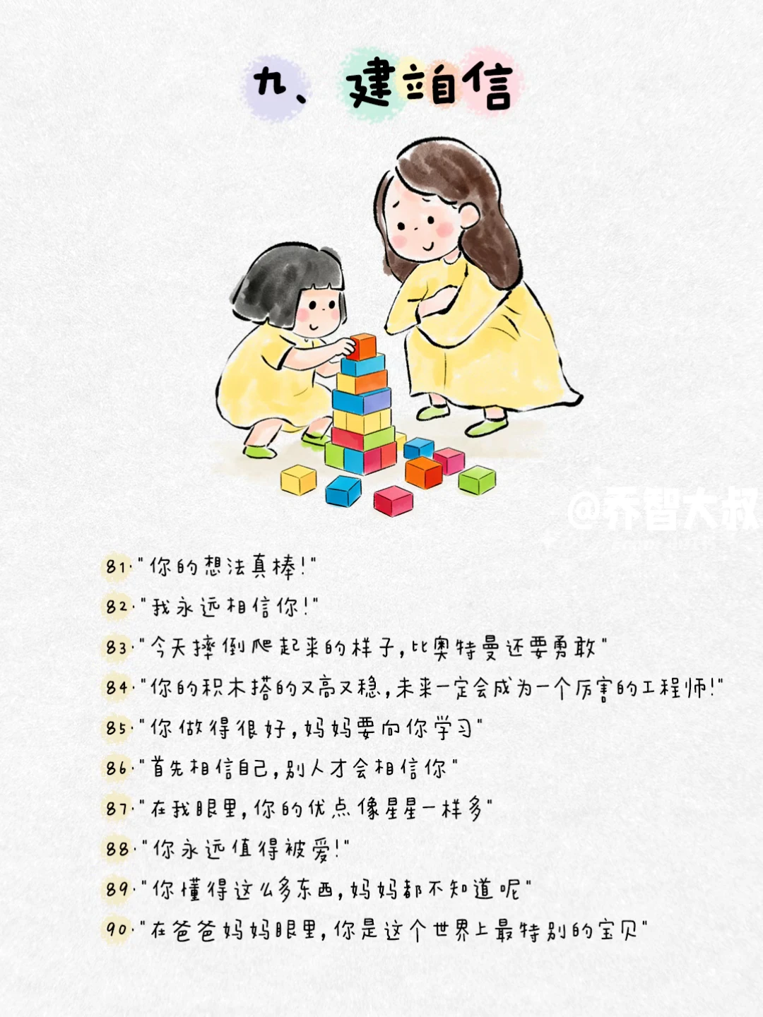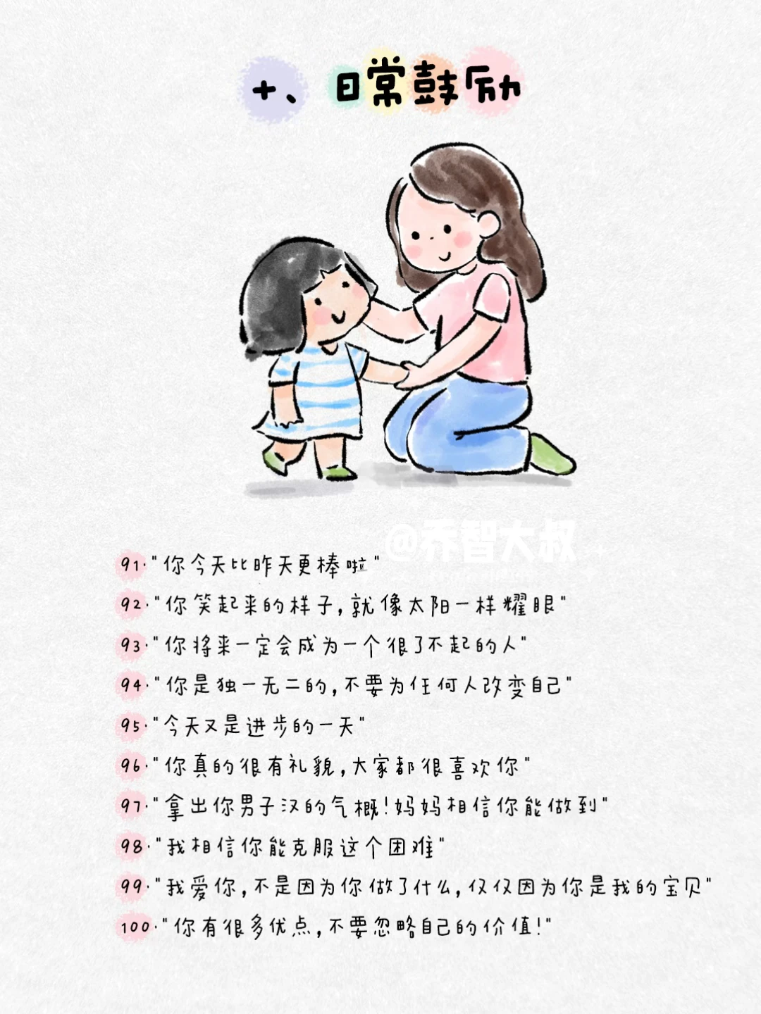 有时候,我们一句话,就能照亮孩子心里那个小小的角落。 不是大道理,而是那些能让他感觉到 “被看见、被懂得、被深深爱着” 的瞬间。 我把这些瞬间,整理成了100句平实却温暖的话。 它们关乎: ✅ 接纳情绪 ✅ 建立自信 ✅ 表达无条件的爱 ✅ 鼓励尝试 ✅ 化解矛盾 ✅ 给予安全感 这些句子,是我在无数个日常、冲突和拥抱中,真正对孩子说过的。 它们像一颗颗小小的种子,在孩子心里生根发芽,长成面对世界的力量。