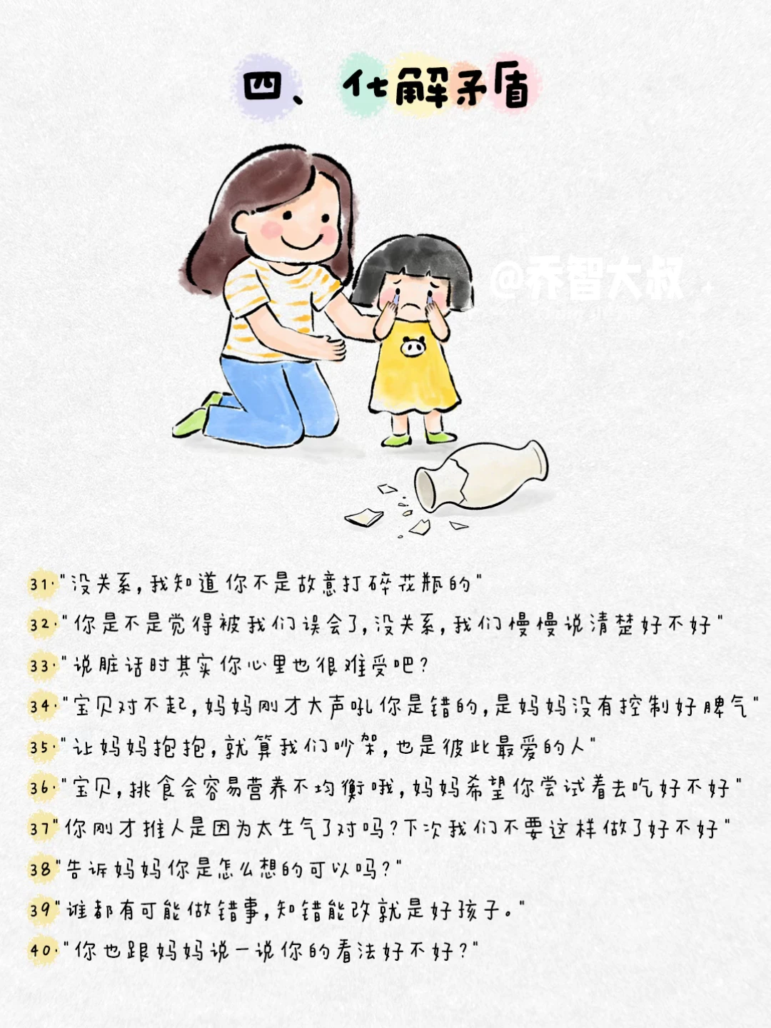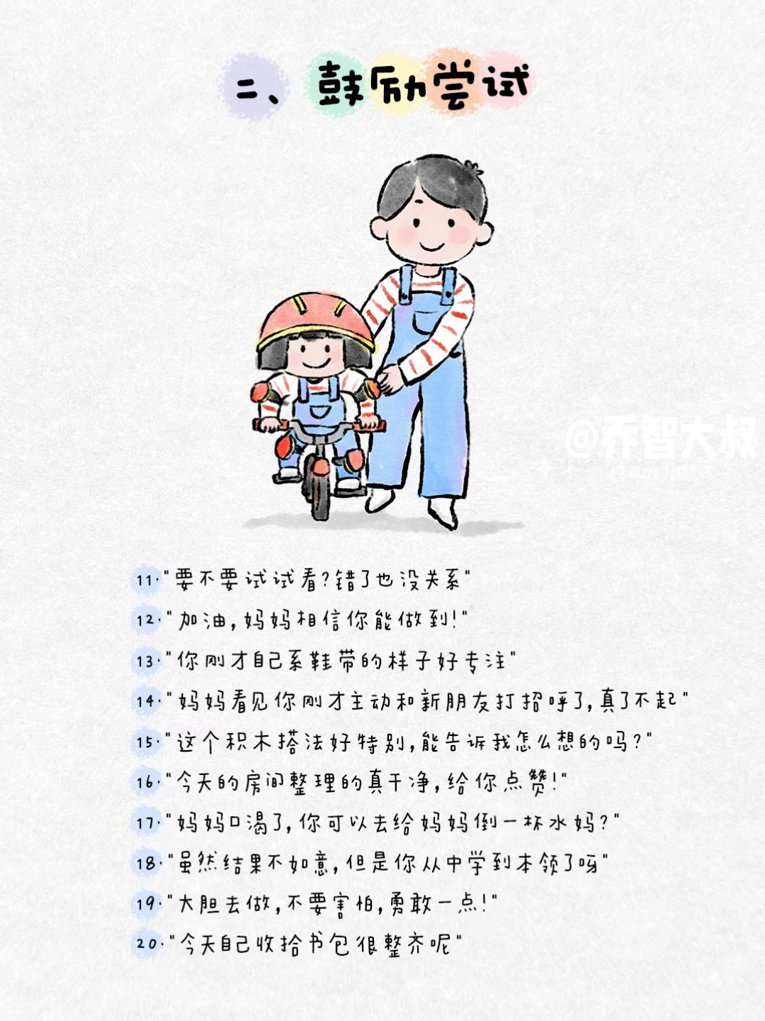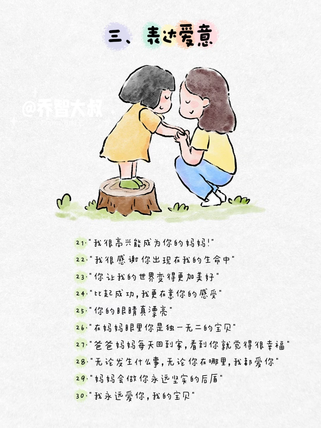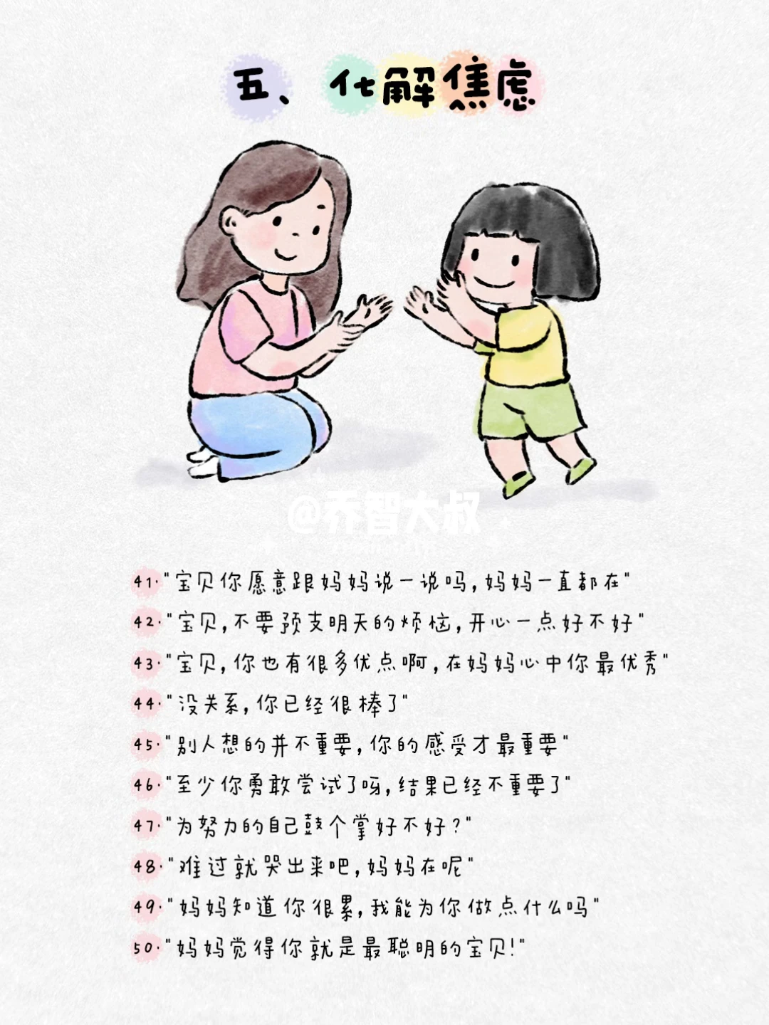 有时候,我们一句话,就能照亮孩子心里那个小小的角落。 不是大道理,而是那些能让他感觉到 “被看见、被懂得、被深深爱着” 的瞬间。 我把这些瞬间,整理成了100句平实却温暖的话。 它们关乎: ✅ 接纳情绪 ✅ 建立自信 ✅ 表达无条件的爱 ✅ 鼓励尝试 ✅ 化解矛盾 ✅ 给予安全感 这些句子,是我在无数个日常、冲突和拥抱中,真正对孩子说过的。 它们像一颗颗小小的种子,在孩子心里生根发芽,长成面对世界的力量。