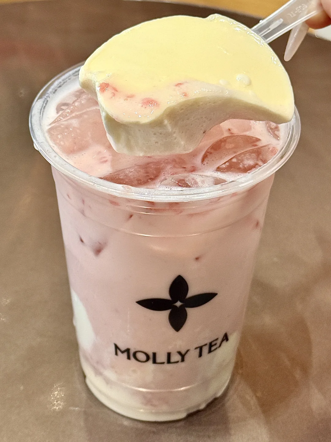 茉莉奶白新出的栀香草莓奶皮子我喜欢你🫶🏻 喝到一次之后我才发现这是我的命中注定,爱到不行 它粉嘟嘟的好可爱 香甜草莓🍓搭配奶皮子,好奶好好喝 真能勺起一大块奶皮子嚼着喝 回味还有清新的苹果味+栀香绿茶,这个神仙组合怎么可能不好喝啊啊啊 个人推荐五分糖/三分糖,少冰,加米麻薯也很nice 决定每天老自一杯,老己一杯,干杯