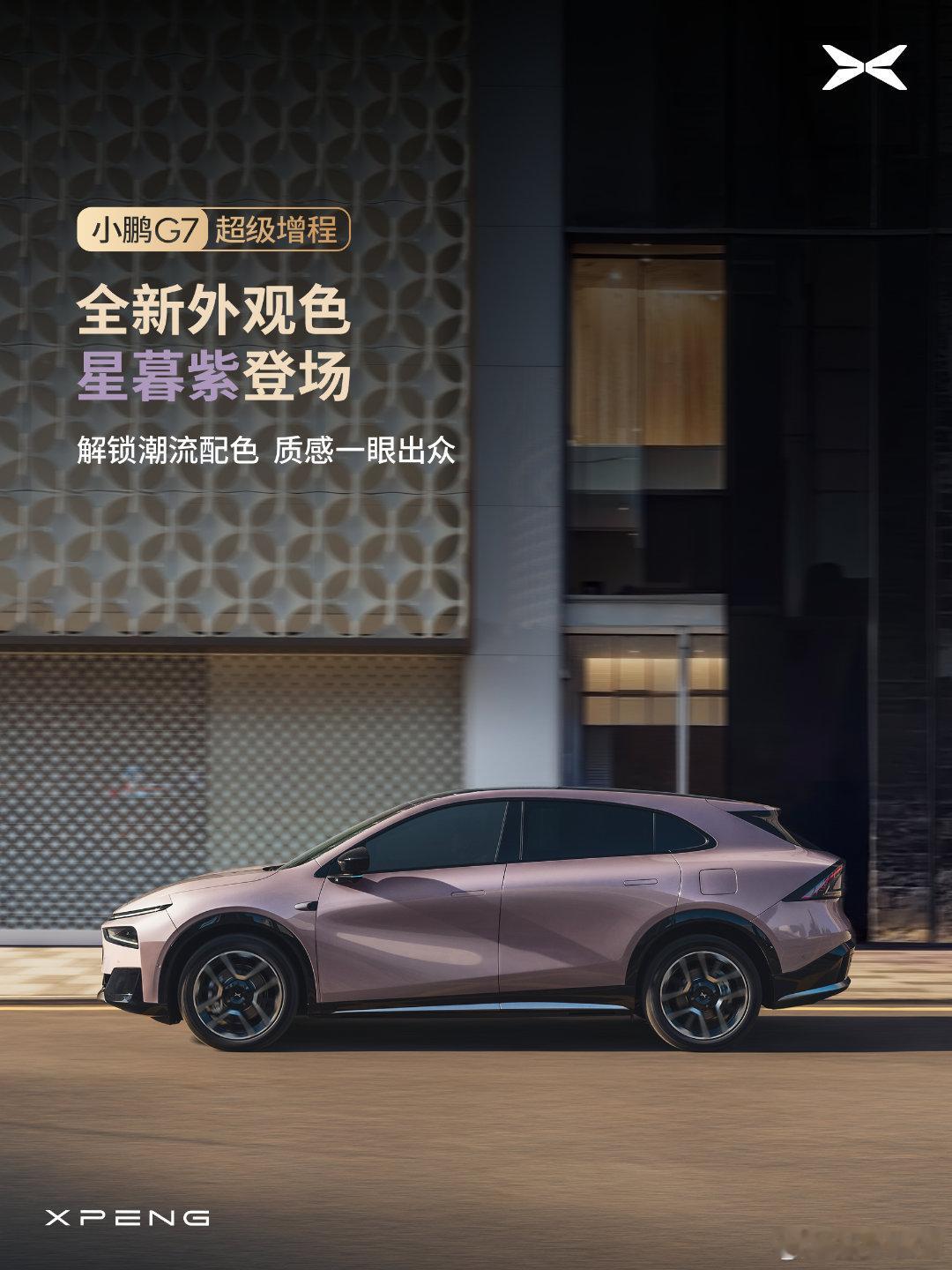小鹏G7超级增程也亮相了纯电续航430公里,综合续航1704公里新增加了星暮紫色