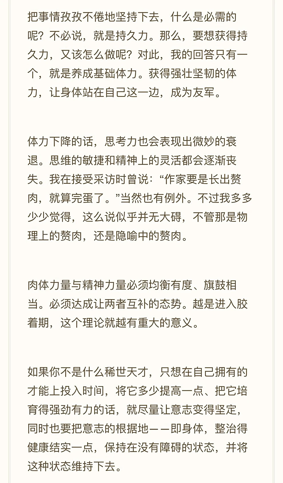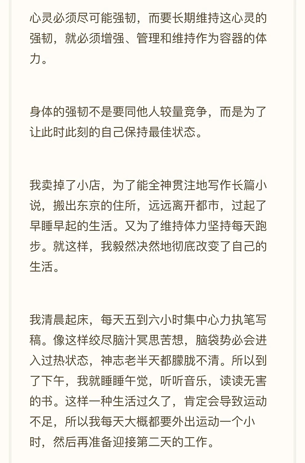 体力不好的人容易处于停滞的状态。 体力好了,感受、观察、行动、意志、直觉、效率都会提高。 这些又会让你的生活事业继续提升,因为软件已经升级了。 p1~p4 韩剧《未生》 p5~p8 安藤忠雄 p9~p10 村上春树《我的职业是小说家》 2026年,一起搞身体吧!