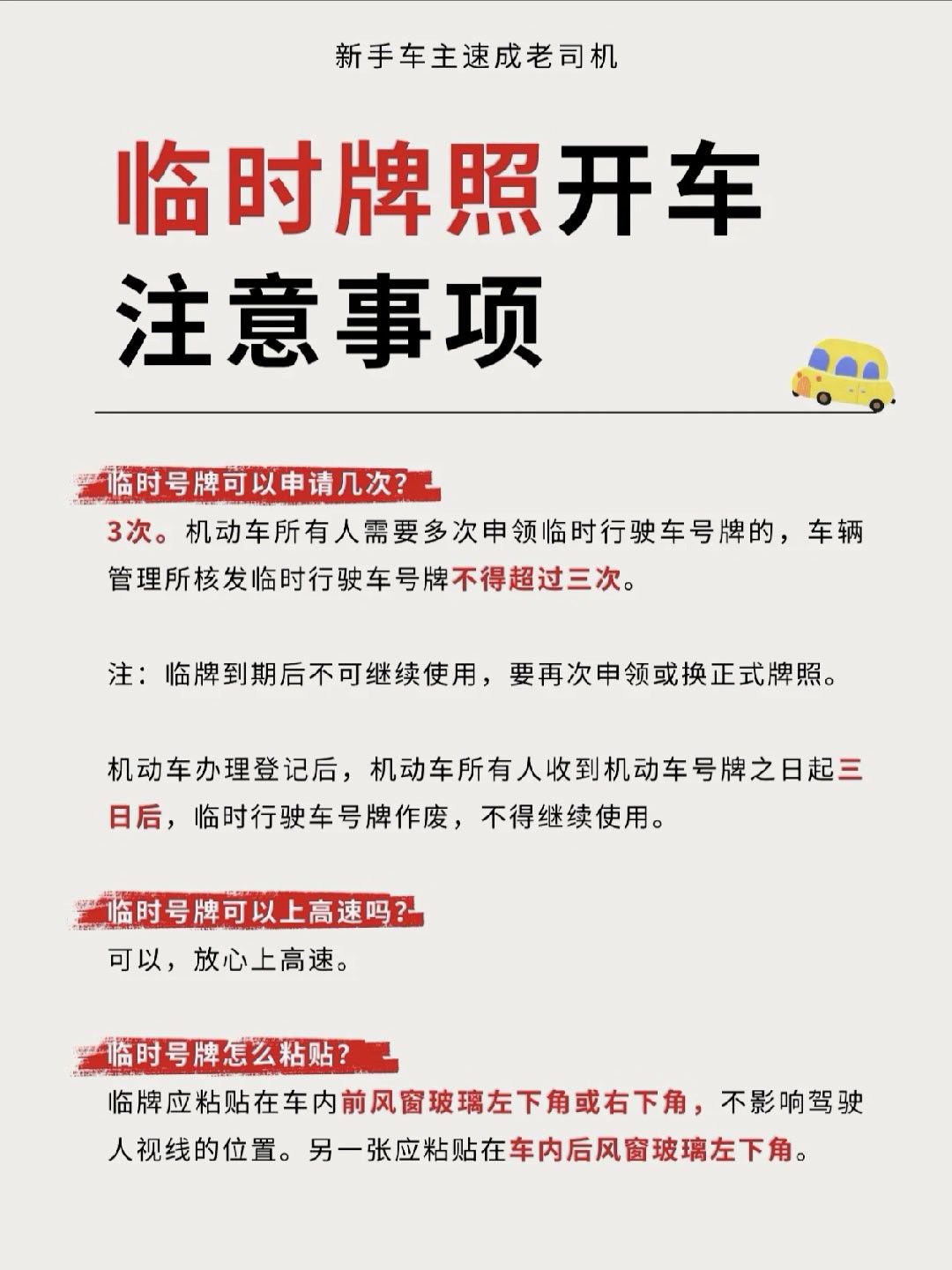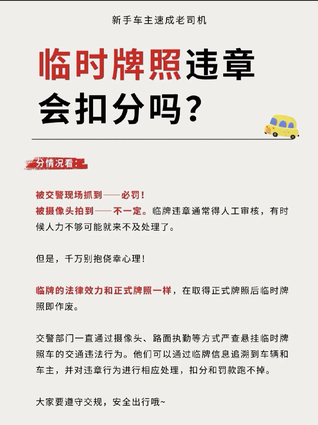 真实车牌还没到用着临时牌照违章了,这样会被扣分吗?得分情况👇▪️被交警现场抓到:必罚!▪️被摄像头拍到:不一定,但别侥幸!临牌和正式牌照的法律效力一样[暗中观察R]一旦查到,扣分➕罚款都跑不掉!临时牌照常见问题解答可以申请几次? 一共3次。能上高速吗? 可以。临牌怎么贴? 一张贴在前挡风玻璃左/右下角;另一张贴在后挡风玻璃左下角。汽车大v聊车