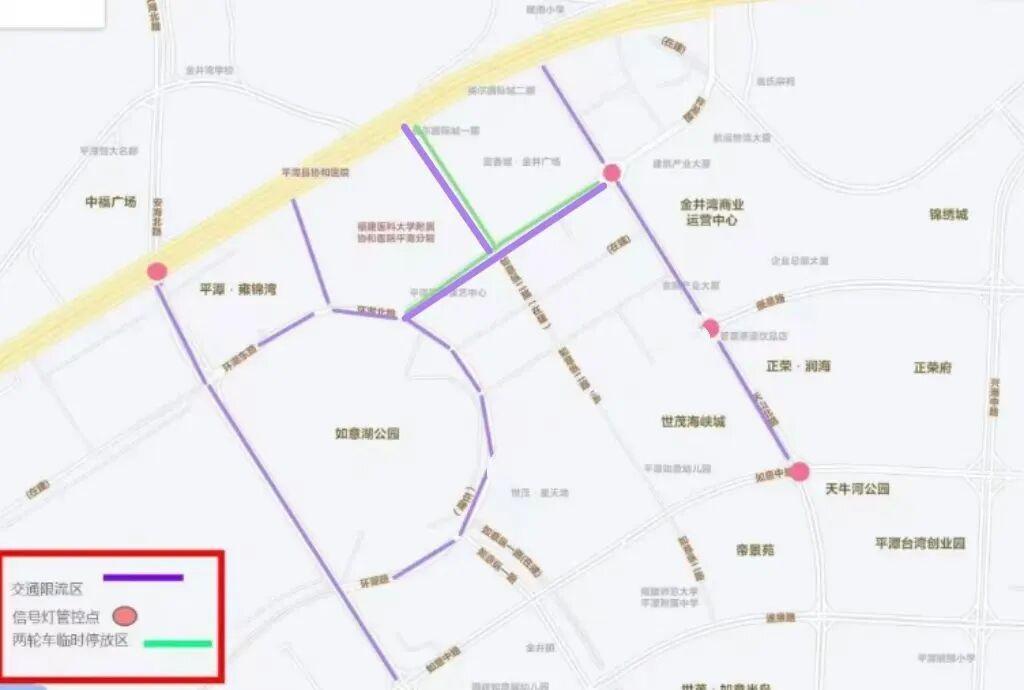 平潭国际演艺中心周边祥湖路、如意纵二路、安海路、环湖北路等路段,根据现场人、车流量采取相应限流管控措施。