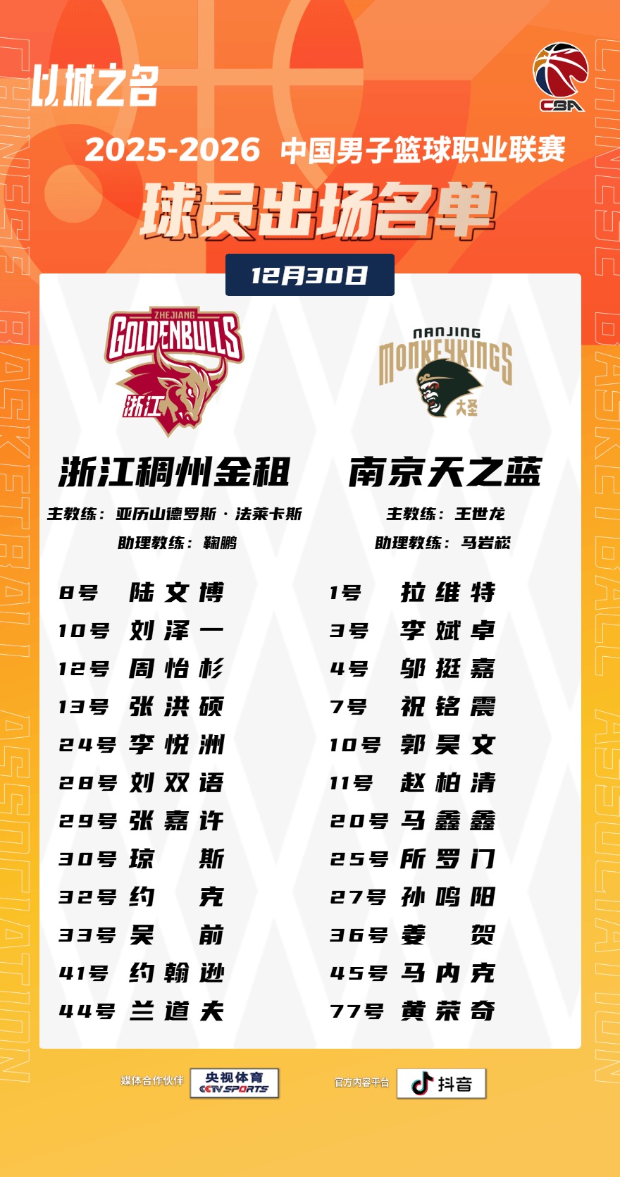 虎扑12月30日讯今晚CBA常规赛,浙江对阵南京的大名单已经公布。