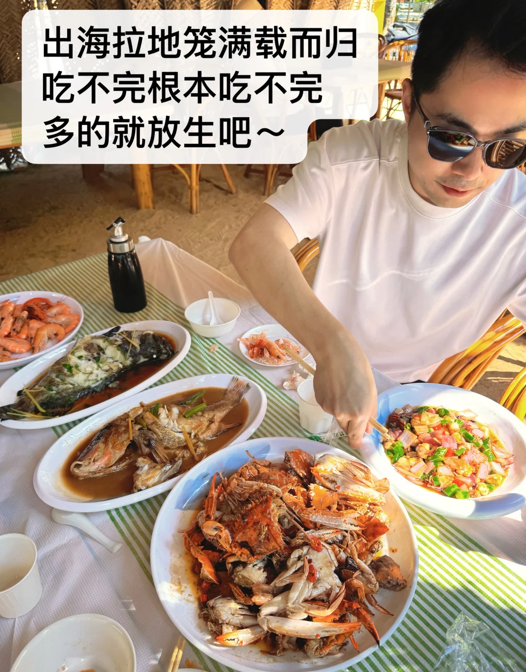 ❺ 美食:上岸后岸边餐厅直接加工,一家三口根本吃不完,最后放生了好多