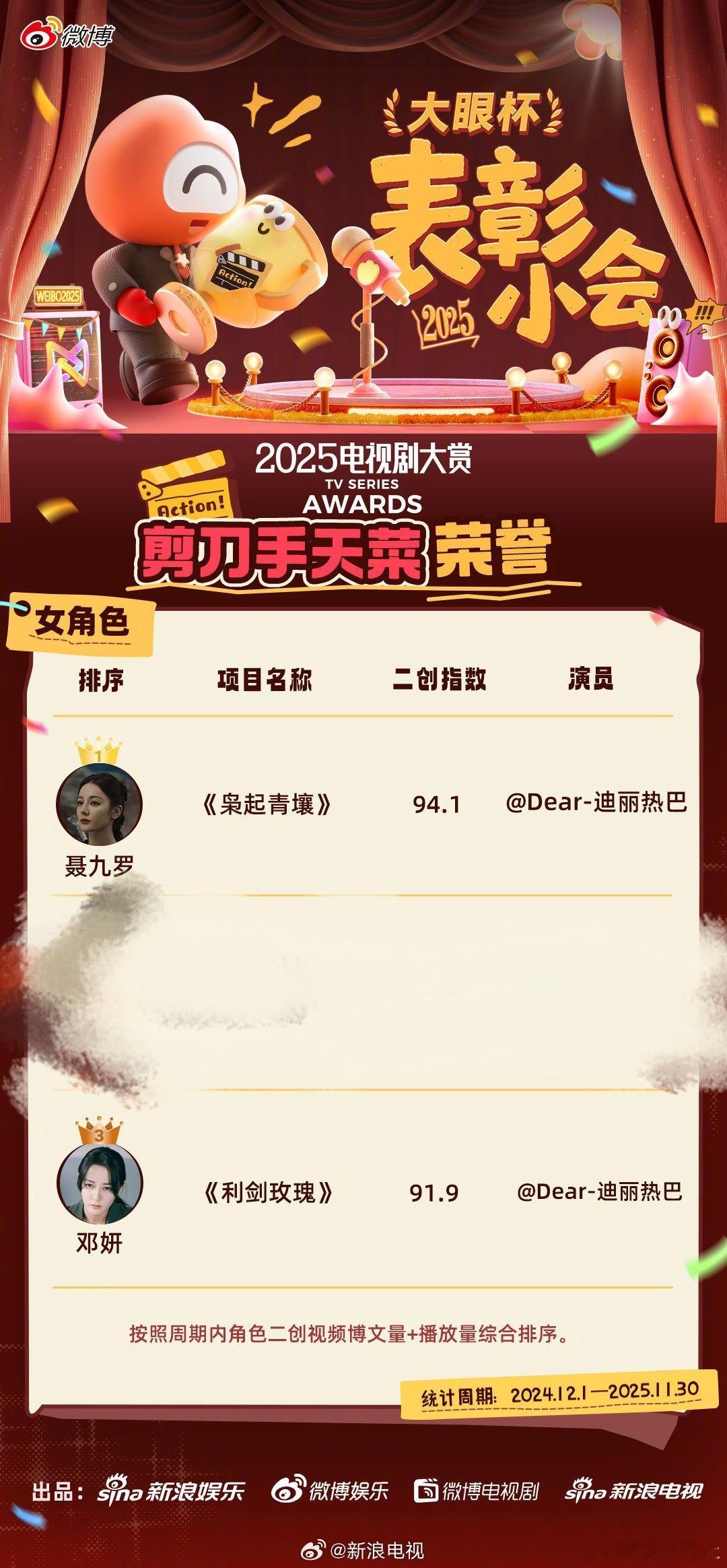 迪丽热巴交出了两份满意答卷2025年微博电视剧大赏报告新鲜出炉!🏆迪丽热巴今年交出的答卷太亮眼了!两部作品《枭起青壤》《利剑玫瑰》均入选多个榜单,聂九罗和邓妍成为二创剪刀手天菜的最爱,口碑收视双丰收,《慕胥辞》贺思慕荣登年度期待女角色TOP1,期待演员迪丽热巴的更多作品! 2025娱乐年终盘点非正式跨年派对