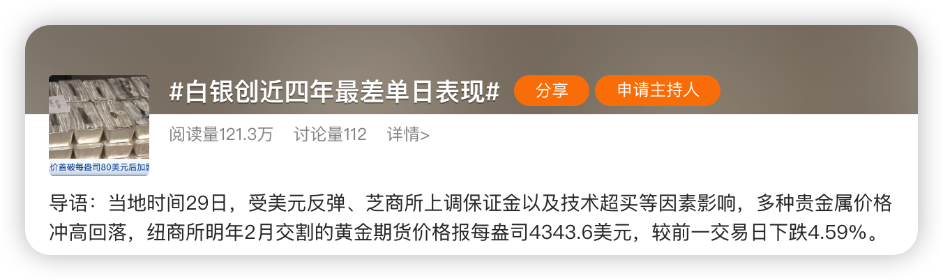 跌也上热搜,涨也上热搜,贵金属算是最近的绝对热门话题。最近真就像过山车,29 号那天白银先是冲到历史新高,结果扭头就跌了快 9% ,连带着国内金价都跌破 1400 了。感觉就是之前涨太猛,加上听说俄乌要和谈,避险资金也就散了。白银创近四年最差单日表现 金饰价格跌破1400元关口 金价暴跌店员称跌幅首次见