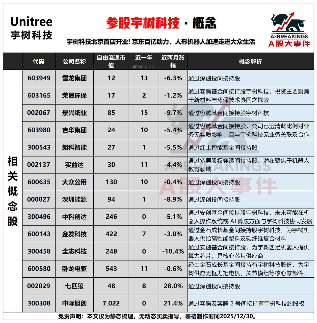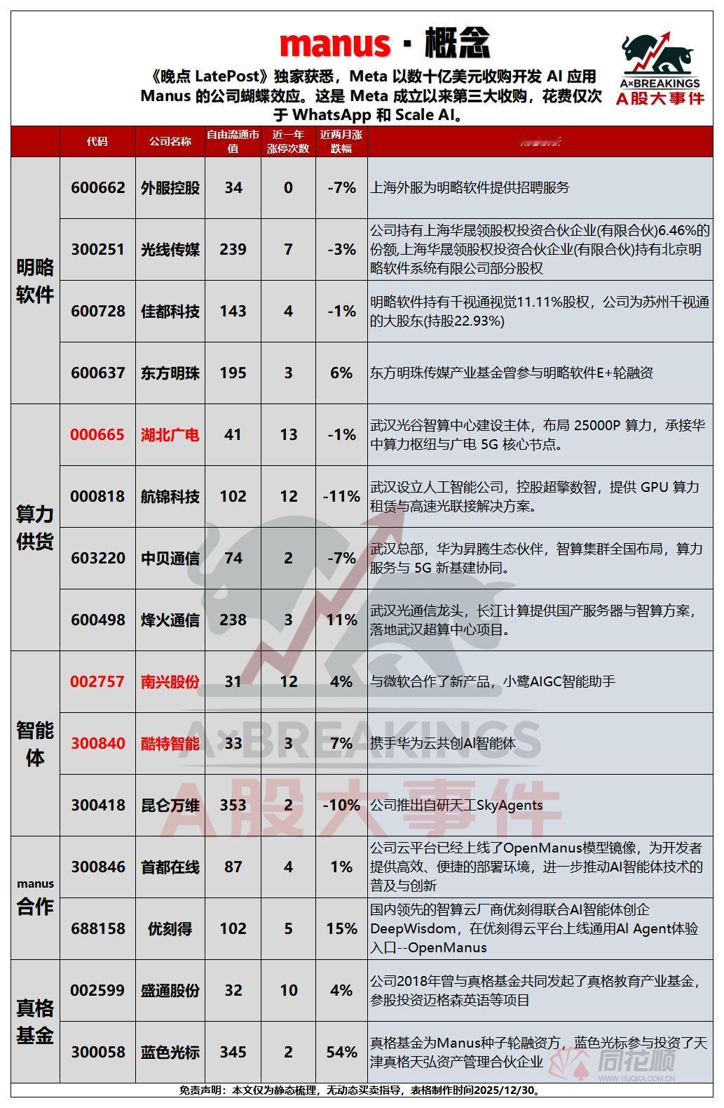 12月31日,周三A股这些板块有望大涨!!! 特斯拉机器人即将量产,26年作为公认的人形机器人量产元年,相关概念股有望迎来大趋势,重点关注:天奇股份、五洲新春、三花智控;宇树科技与京东合作的首家线下门店开业,加速人形机器人走进大众生活,参股宇树科技概念值得期待,重点关注:雪龙集团、中科创达、全志科技;manus被meta以数十亿美元收购,也是meta历史上第三大收购,相关概念值得期待,重点关注:酷特智能、南兴股份、湖北广电!!!