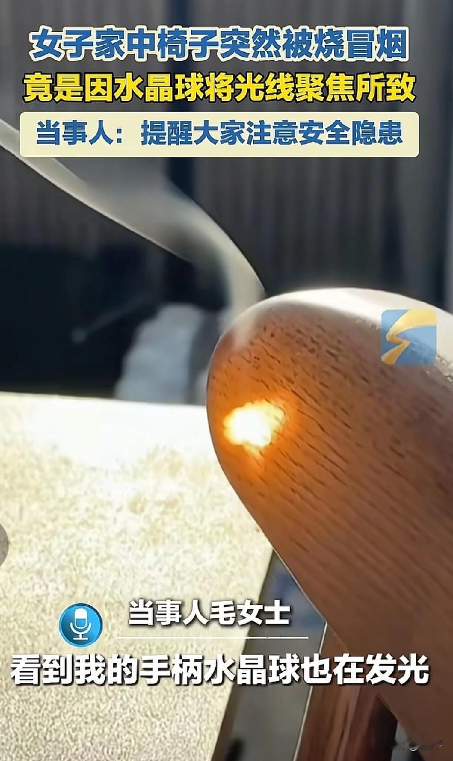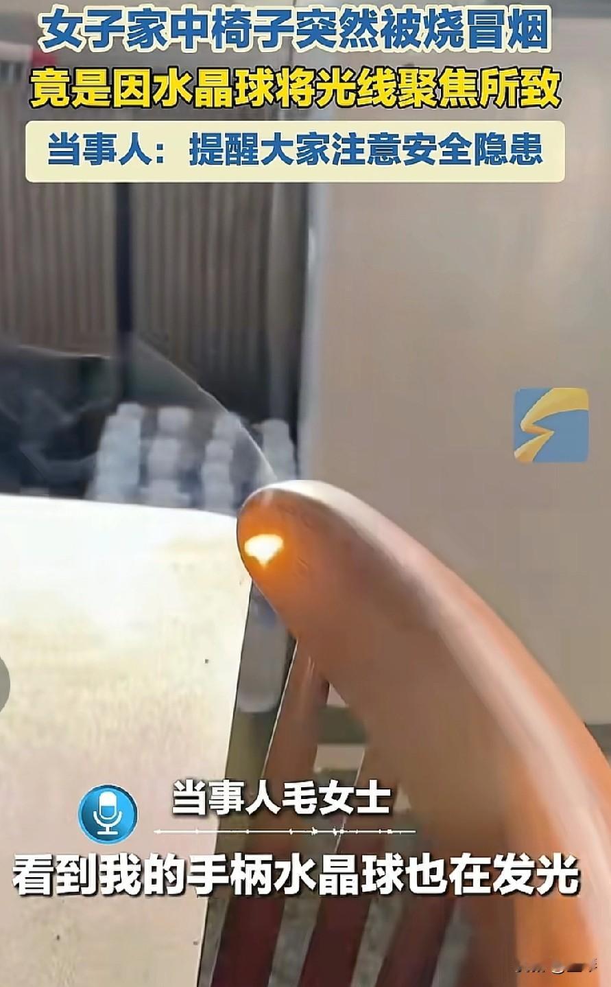 水晶球竟成“纵火犯”,家中起火未必是人为,这些光学摆件藏安全隐患。 “家里椅子突然冒烟起火,查了半天居然是水晶球惹的祸!”毛女士的经历让不少人惊觉,家中看似精致的光学摆件,竟可能暗藏火灾风险。 毛女士发现家中椅子莫名被烧冒烟,排查后才找到元凶——放置在窗边的水晶球。 水晶球如同凸透镜,将阳光聚焦在椅子表面,持续的高温最终引燃了木质家具。她还观察到,水晶球在阳光下会把光线聚焦成强光点,这正是起火的核心原因。 其实不只是水晶球,生活中不少透明弧形物品都有聚光起火的风险:玻璃花瓶、球形鱼缸、放大镜,甚至是装了水的塑料瓶,在阳光直射下都可能成为“隐形火源”。 这些物品会将平行的太阳光汇聚成一点,产生高温,若聚焦在纸张、布料、木质家具等易燃物上,短则几分钟、长则数小时就可能引发火灾。 很多人在家中起火后第一反应是人为因素或电路故障,却忽略了这类光学聚光的隐患。尤其是将透明弧形摆件放在窗边、阳台等阳光直射区域,或是靠近窗帘、地毯、书本等易燃物时,风险会大幅提升。 毛女士的经历也给所有人提了个醒:摆放家居摆件时,要避开阳光直射的易燃区域;若家中有类似的聚光物品,及时调整位置,避免成为潜在的“纵火犯”。毕竟,看似不起眼的小物件,也可能酿成大事故。
