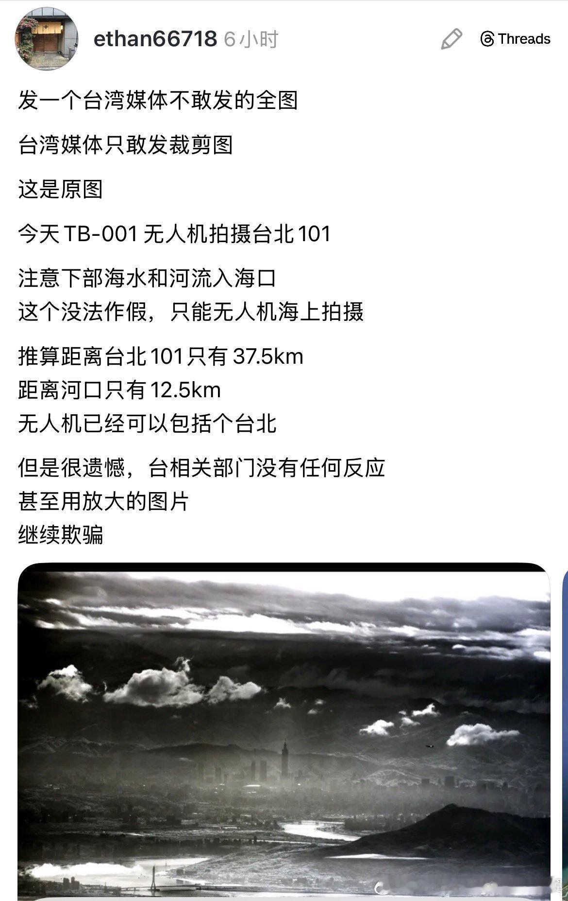台媒声称无人机俯瞰台北101是心理战中国人民解放军东部战区在“正义使命-2025”演习期间,发布了解放军无人机俯瞰台北101大楼的视频画面。针对该视频,台湾当局及部分媒体声称这是“典型认知作战”和“心理战”。部分台媒及军事社群甚至声称该画面疑似为“电脑合成”或“盗用碧山巖监控画面”。无人机都飞到头顶了,还在那里心理战呢。5个主要演习区域全部进入台湾主张的“12海里领海”范围内,部分演习区域距离台岛最近仅约4.7海里(约8.8公里)。已经有军事博主通过画面中的海水、河流入海口结构(淡水河口)进行比例推算,认为无人机拍摄点可能位于距离台北101约 37.5 公里的海上空域。其实,蛙蛙只是不愿面对而已。