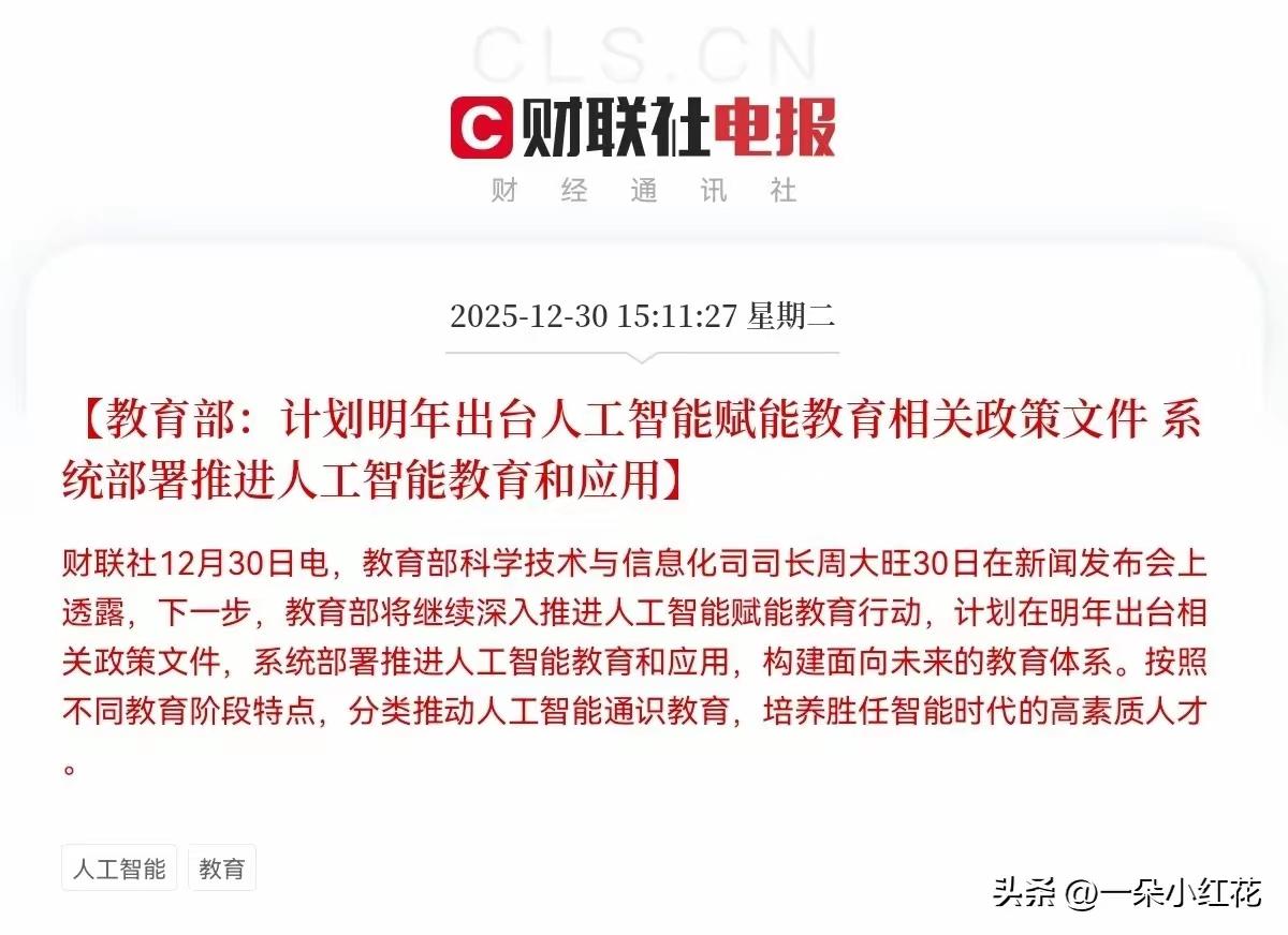 收盘后各类利好消息纷至沓来。一则是新的国补消息,另一则是教育部门单独出台的利好,与人工智能辅助教育相关。受此影响,明天这两个板块的股票有望活跃起来,进而对大盘形成一定的拉升作用。所以,明天大盘收红的可能性颇高,尤其是作为年底的最后一个交易日,收红的概率更是极大。 大家可以开开心心,快快乐乐的过元旦!人工智能新政 科创板人工智能 人工智能回调 教育利好政策 股市补涨 教育行业新基建 ai教育概念股