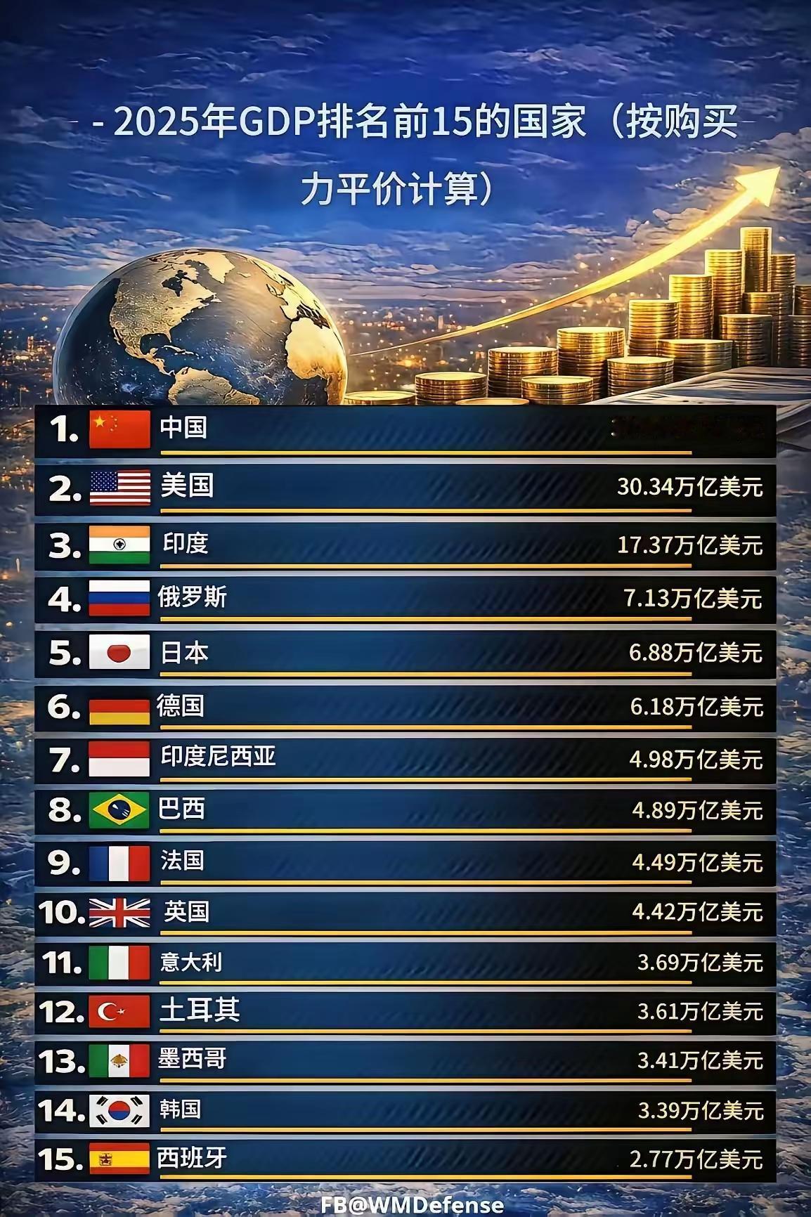 各国“家底”大比拼:2025全球GDP(购买力版) 1.中国:以39.44万亿美元荣膺“全能型卷王”称号! 话说按购买力平价算,咱们这数据简直亮瞎了,凭借“基建狂魔+制造大国”的双重Buff直接登顶,给人一种一觉醒来列强竟是我自己意外。还别说,大家都搞经济,咱们甚至卷成把地里的红薯都要卖出全球连锁的架势! 2. 美国:30.34万亿美元 ,虽然老大地位不保,但是人家手握世界货币“印钞机”,玩的是“高端局”。虽然外债堆得像山,但印钞机一开,全球买单,“收割”模式还在高速运转,不服不行呀! 3.印度:17.37万亿美元 ,凭借 “人口红利拆迁队”的威名,三哥稳居第三,这排名全靠人多力量大。虽说人均GDP不咋地,但靠着“人海战术”和“低价套餐”,硬生生把总量堆上去了。这就好比班里的“笨鸟”,虽说作文水平不高,但是字数凑得多,老师也愿意酌情多给些印象分。 4. 俄罗斯:7.13万亿美元 , “硬核狂生”。 老毛子这波操作最骚!都被制裁成那样了,还能把日本、德国这些“优等生”挤到后面去。这说明在“战斗民族”眼里,经济制裁虽然不好受,但是喝伏特加的体质还是很能抗压的! 5. 日本 & 德国:6.88万亿 & 6.18万亿 争老五谁都不服谁,其实这哥俩都已经沦为“精致的苦力工”了。 所以这两位昔日的“老牌富哥”,这次只能排在三哥和老毛子后面吃土了。尤其是德国,制造业还在吭哧吭哧干活,日本还在精益求精,结果发现账本上的数字还没印度“涨”得快。只顾闷头干活,忘了看路,所以悲剧了! 看完这个榜单,我只想说:按购买力平价算,这世界真是太魔幻了! 在座的各位,你们怎么看?