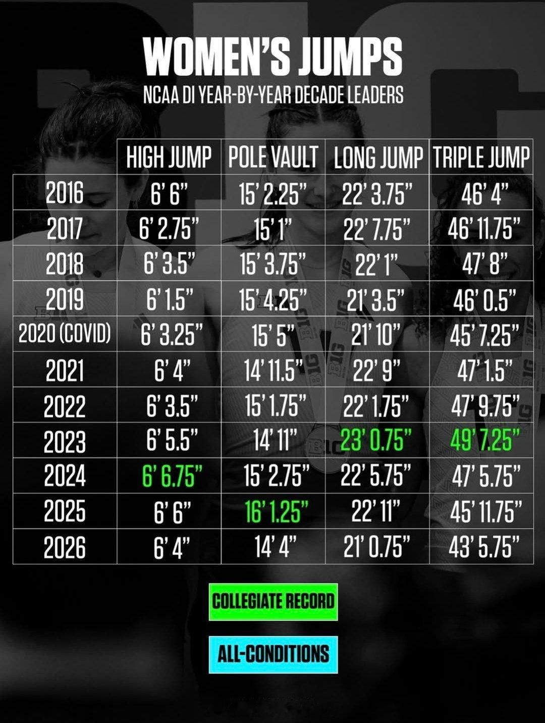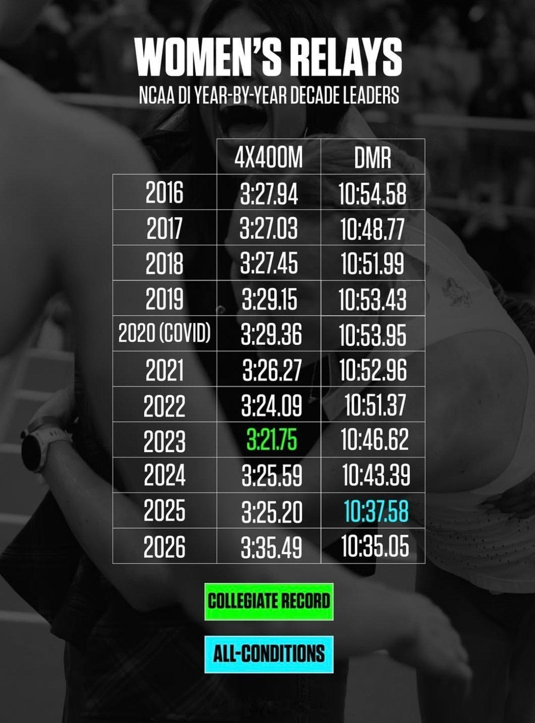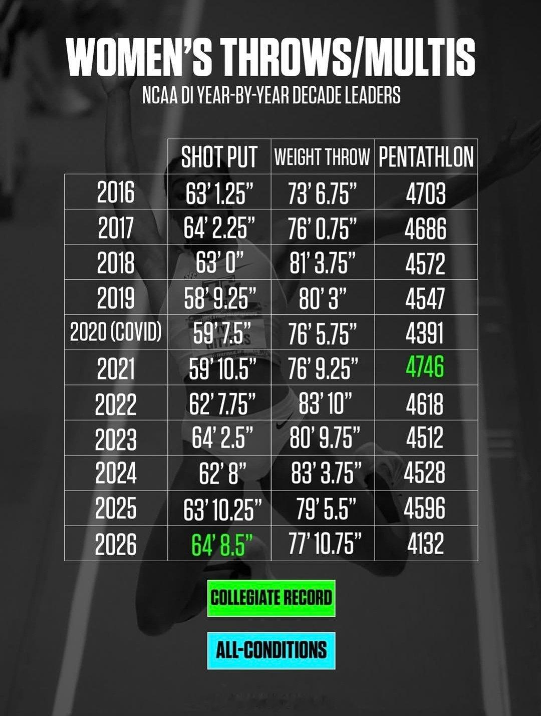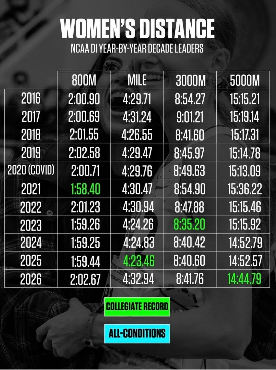 NCAA一级联盟女子近10年的室内各项目的最好成绩,纪录都是历史级别的了。确实是疫情那几年的整体生源质量很好,自打世界田联把NCAA排除在积分体系外后,这个成绩有所下降…田径说一哈田径你不知道的田径故事