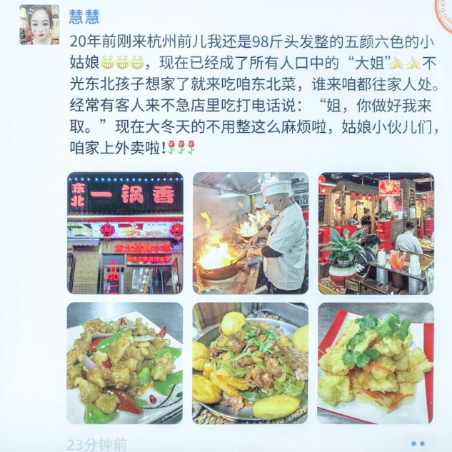 “20年前刚来杭州时我还是98斤、头发五颜六色的小姑娘,现在已经成了所有人口中的‘大姐’,不光东北孩子想家了就来吃咱东北菜,谁来咱都往家人处。现在大冬天的不用整这么麻烦啦,姑娘小伙儿们,咱家上外卖啦!”这两天,北东一锅香的老板娘慧慧发了一条朋友圈,一时间引发了不少食客们点赞。