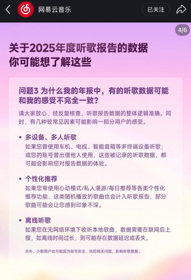 经反复核查,听歌报告数据的整体逻辑准确。同时,有几种较常见因素可能影响一部分用户的感受。