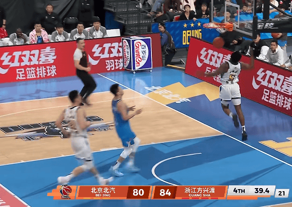 第四节比赛中,杰曼关键时刻掉球失误,布朗抢断反击双手飞扣领先北京6分。