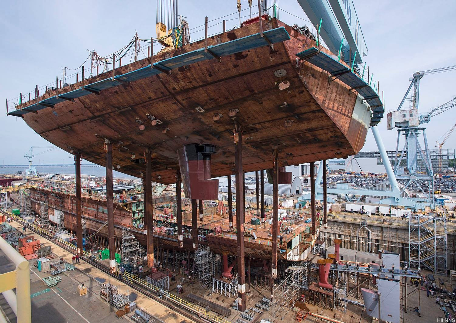 又是“大型集装箱船”,但是这次直接公开了船体的建模图片只不过侧视图的缩放比例很崩坏,只有仰视图的比例是大致正确的从仰视图上可以看出,船体艉部形制不再是之前的巡洋舰艉,改成了线条更加凌厉的方艉不同于美系航母的艉部设计,“大型集装箱船”尾部船体的内收幅度更小,且未有继承美系航母的祖传艉部弧线(小鹰-67肯尼迪-尼米兹和79肯尼迪都有弧线),而是采用了更干净的截面造型设计,与玛丽女王2号、出云级的尾部设计更加类似总的来说,这套粉紫色的建模所透露出的造型细节是比比之前公开的缩比船模图要多一些,但也没多多少但至少有了个基本正确的仰视图,为各位画00X想象图的CG大佬们提供了非常重要的造型参考