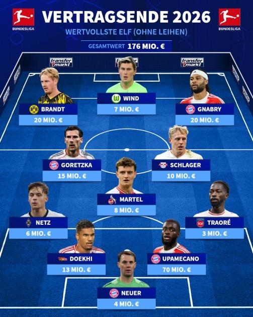 虎扑12月30日讯德转公布了合同德甲即将在2026年到期的最高身价阵容(不含租借球员)。