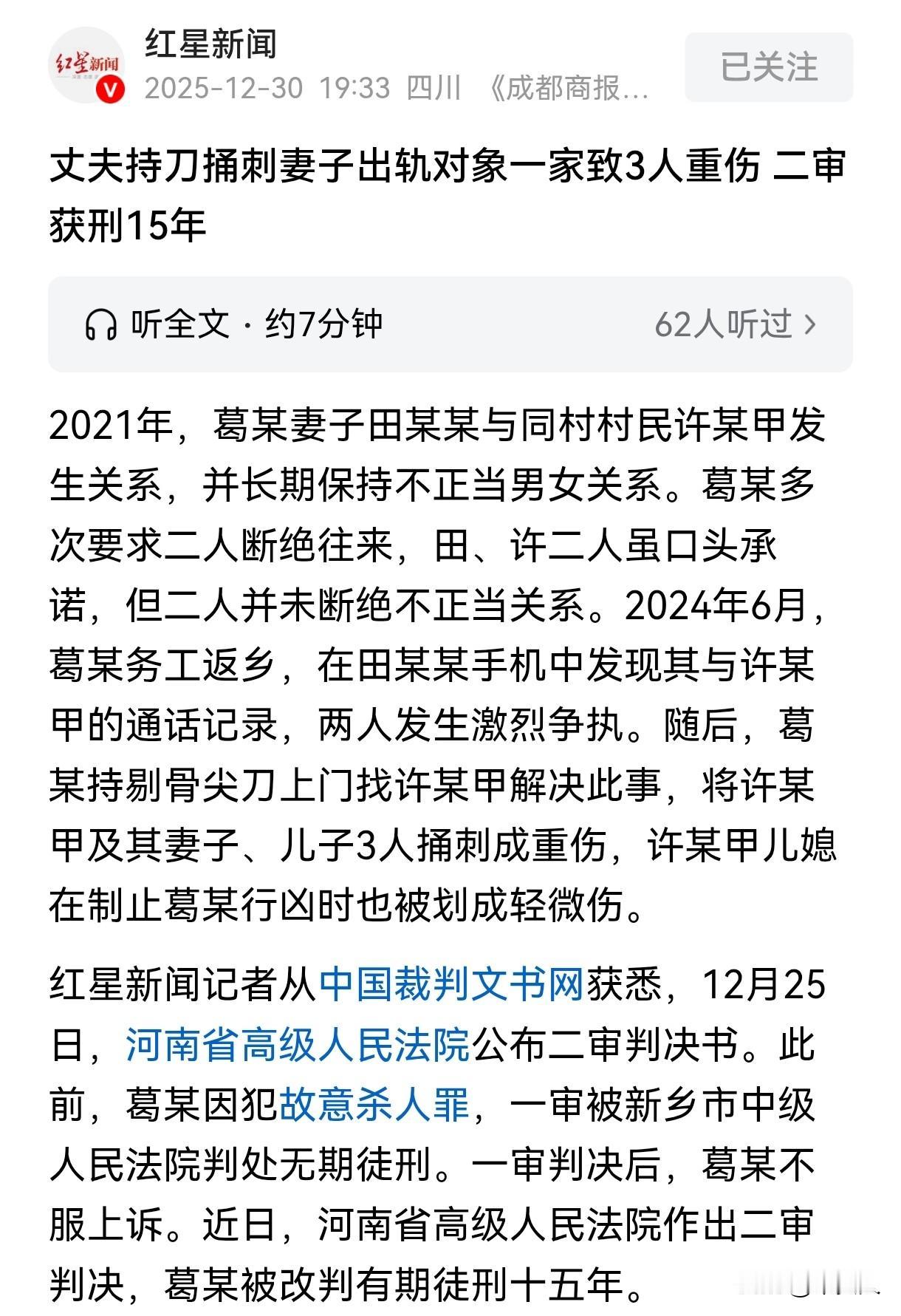 “太冲动了!”河南新乡,男子发现妻子和同村村民发生关系,并长期保持不正当男女关系,他找到妻子情人,对方承诺跟男人妻子断绝来往。可男子从外地务工回家,发现妻子和情人的通话记录,怒从心起,找到妻子情人家,将妻子情人、对方妻子及其儿子刺成重伤,一审法院判决男子无期徒刑,男子不服,二审有了不同看法。 葛某和妻子田某结婚多年,日子虽平淡,但感情还算融洽。 2016年,葛某和妻子在老家养羊,和同村村民许某的来往多了起来。 起初,葛某并未觉得有什么异样,可之后他感觉妻子和许某的来往似乎太过密切了。 2023年2月,葛某查看安装在自家羊圈旁的监控时,意外发现妻子和许某举止亲密。 在他的追问下,妻子承认自2021年起,她和许某发生关系,走到了一起。 葛某只觉得一股怒火直冲脑门,自己辛辛苦苦为了这个家打拼,妻子却做出了这种不要脸的事情。 他强压怒火,找到许某,要求许某不要再跟自己妻子来往了。 许某和田某信誓旦旦的承诺,以后两家各过各的,他们不再来往,不再联系。 有了妻子和许某的保证,葛某也放下心来,之后他去了外地打工。 2024年6月初,葛某从外地务工回家,却在妻子手机中,发现了妻子和许某的通话记录,这一次,他彻底爆发了。 他质问妻子,为什么要这样做,可田某也不甘示弱,双方发生了激烈争吵。 葛某把所有的矛盾都归咎于许某,对许某的恨意达到了顶点,他心里只有一个念头:许某毁了自己的家庭,一定要让他付出代价。 2024年6月18日晚上8点左右,葛某怀揣着一把剔骨刀,气势汹汹地去找许某。 当他到达许某家时,许某、许某妻子、儿子、儿媳,一大家子人都在。 葛某把许某从厨房叫出来,不久后,双方发生争执,葛某再也控制不住自己的情绪,从口袋掏出尖刀,朝着许某的腹部捅去。 许某的儿子、妻子和儿媳见状,急忙上前制止,可此时的葛某已经失去了理智,又拿刀朝他们捅去。 许某见状,顺手拿起一把铁锹想要阻止葛某,葛某也拿了一把铁锹,打掉了许某手中的铁锹,然后将许某拍倒在地,继续捅刺。 许某的妻子和儿媳拼尽全力,终于把葛某手中的尖刀夺走。 可就在村医救助许某等人时,葛某又从许某家中拿出一把菜刀,想要继续砍许某,许某妻子多次下跪,恳求葛某停止行凶。 这场悲剧,最终导致许某、许某妻子和儿子3人重伤,许某儿媳轻微伤。 葛某原本拥有一个看似美满的家庭,却因为妻子的背叛和许某的介入,生活陷入了无尽的痛苦之中。 许某和田某的婚外情,不仅违背了夫妻之间的忠实义务,也违背了公序良俗,是不道德的。 《民法典》第8条规定:民事主体从事民事活动,不得违反法律,不得违背公序良俗。 田某和许某在婚姻中存在过错,可即便如此,葛某也不应该采取极端方式来解决问题。 冲动和暴力只会让事情变得更糟,不仅无法挽回家庭,还会让自己陷入万劫不复的境地。 葛某因为一时的愤怒,冲动之下持刀行凶,造成了3人重伤的严重后果,必须为自己的行为付出代价。 《刑法》第232条规定:故意杀人的,处死刑、无期徒刑或者十年以上有期徒刑;情节较轻的,处三年以上十年以下有期徒刑。 一审法院判决葛某犯故意杀人罪,判处其无期徒刑,并赔偿许某12万余元,赔偿许某妻子63000 余元,赔偿许某儿子48000余元,赔偿许某儿媳5441元。 一审判决后,双方均不服,提起上诉。 二审法院认为:许某和葛某妻子长期保持着不正当男女关系,对引发本案存在明显过错。 案发后,葛某得知他人已经报警,并没有选择逃离现场,而是在现场等待民警处理,到案后也如实供述了自己的犯罪事实,属于自首。 《刑法》第67条规定:犯罪以后自动投案,如实供述自己的罪行的,是自首。对于自首的犯罪分子,可以从轻或者减轻处罚。其中,犯罪较轻的,可以免除处罚。 另外,在二审期间,葛某还取得了被害人许某一方的谅解,可以依法对他从轻处罚。 最终,二审法院判决葛某犯故意杀人罪,判处其有期徒刑15年。 葛某本是婚姻里的受害者,却因为一时的气愤,变成了施暴者,一时冲动,将事情推入无法挽回的地方,同时也毁了两个家庭。 在生活中,遇到另一半做了对不起自己的事情,一定要保持冷静和理智,用正确的方式去应对,千万不要让愤怒冲昏了头脑,做出让自己后悔终身的事。 无论男女,都要洁身自好,不要去介入别人的家庭,婚外情就像一颗不定时炸弹,随时可能摧毁双方家庭。 《民法典》第1091条规定:重婚、与他人同居、实施家庭暴力、虐待、遗弃家庭成员或者有其他重大过错导致离婚的,无过错方有权请求损害赔偿。 如发现另一半出轨,有重大过错行为导致夫妻感情破裂,可以离婚,并要求对方给予损害赔偿。 关注@木头人 ,从法律角度看世界,感受不一样的人情冷暖。(图片来自网络)