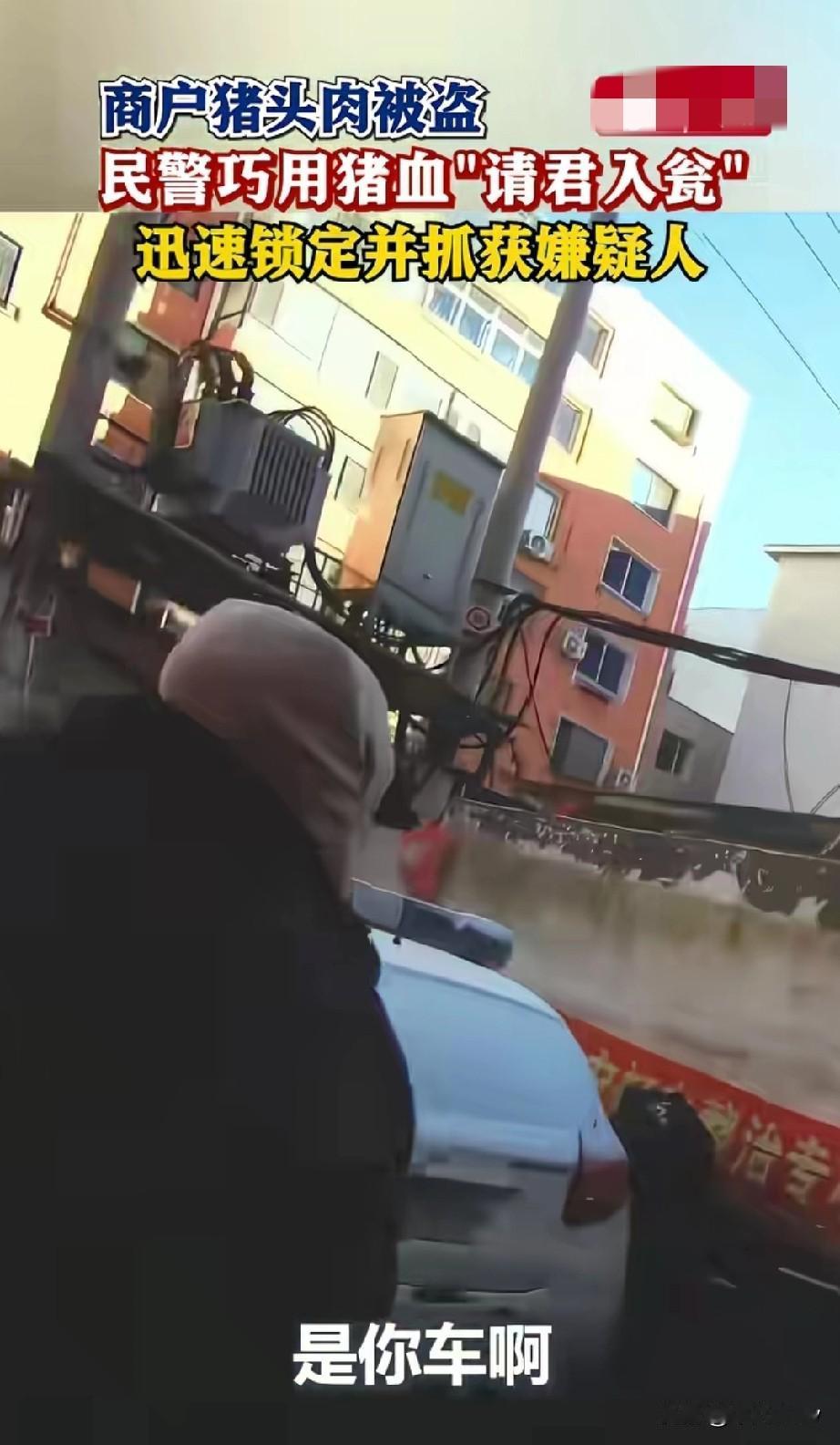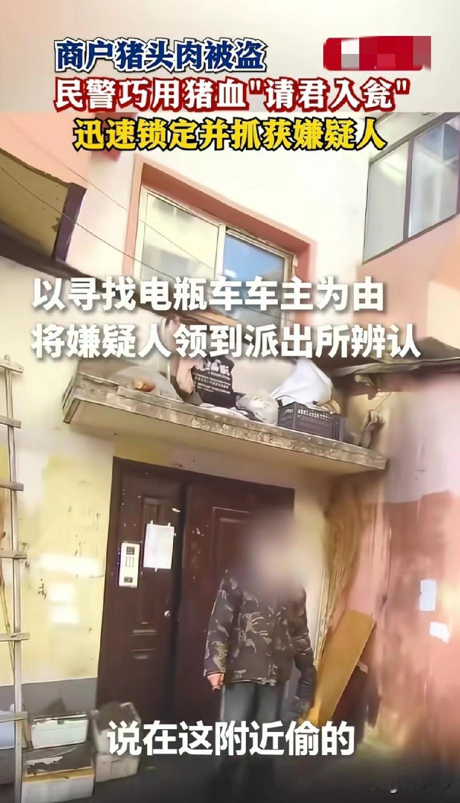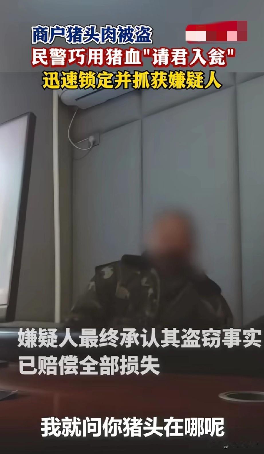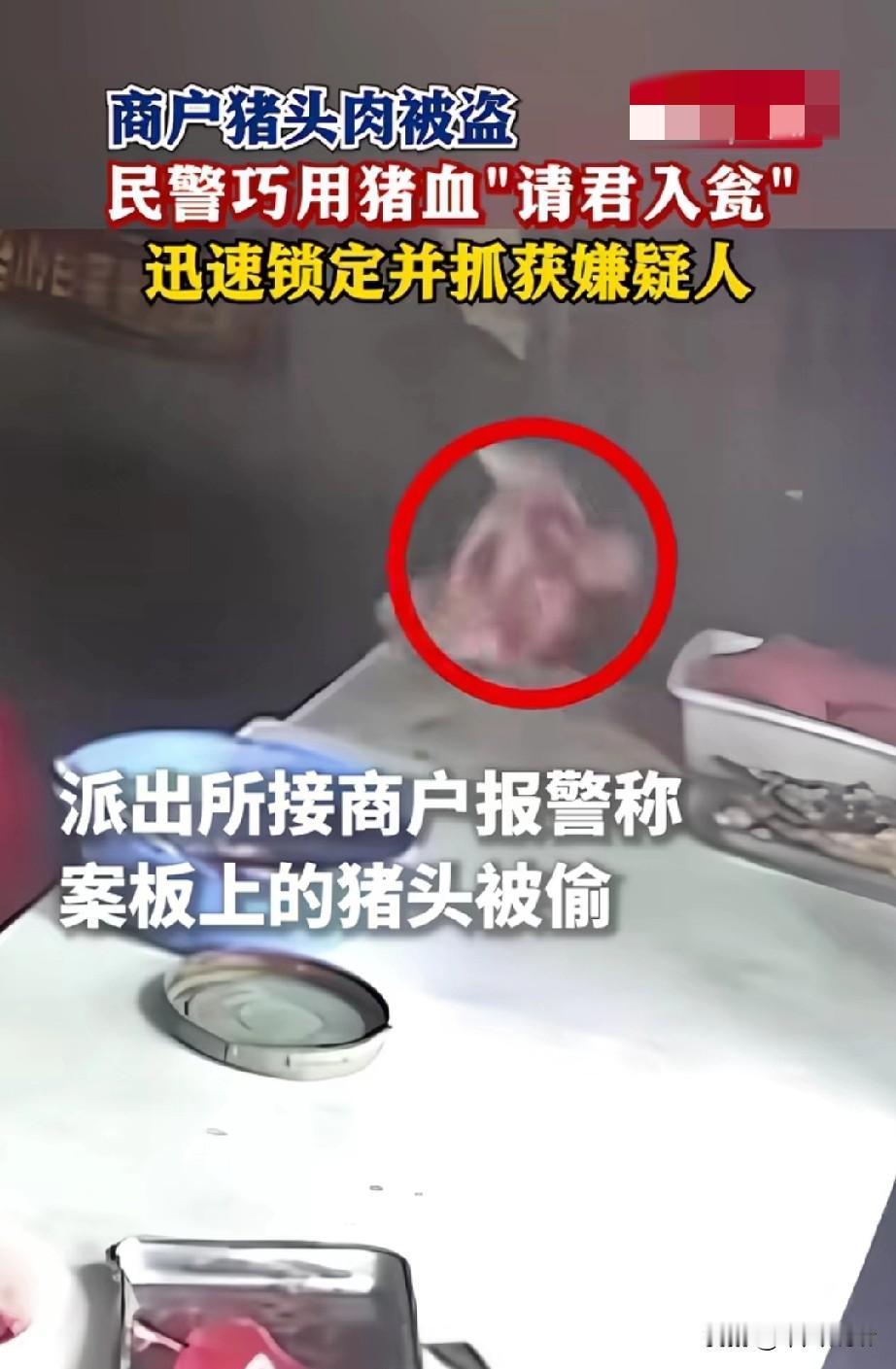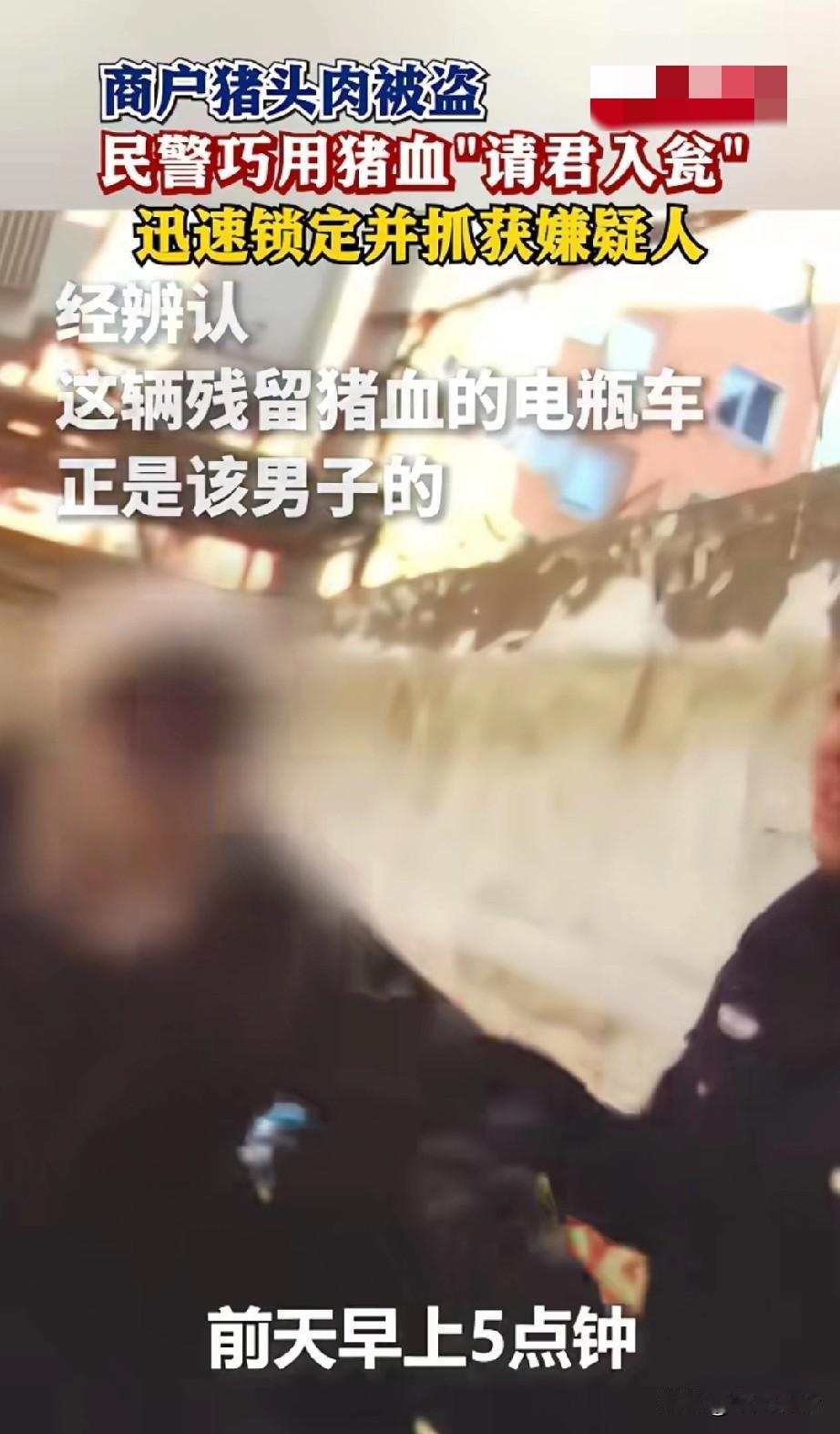 一男子鬼迷心窍偷猪肉,警察巧设妙计“引蛇出洞”逮个正着! 近日辽宁铁岭一商户老板报警称自己家店铺的一个猪头被小偷偷走。报案以后辖区派出所民警在该辖区进行了摸排,在一个住宅小区楼下发现了了一辆电动车。电动车的踏板上有明显的猪血和猪毛遗留物,所以警察就锁定了小偷一定是这个电动车的主人。 (信息来源:华商报) 于是警察就当场把电动车带回了派出所。第2天警察到电动车所在的的小区向住户喊话,是谁家的电动车丢了?我们派出所抓到了一个偷电动车的小偷。 果不其然,电动车车主听到警察喊话,心想自己的电动车终于可以找回来了,男子果断现身。可他怎么也没有想到这正是警察设的妙计让他自投罗网。 在派出所的询问室里男子不得不交代是自己前一天凌晨5点骑车偷了肉铺的一颗猪头的事实,顺便卖了换钱花了。最后该男子赔偿了店铺的损失! 莫伸手,伸手必被捉!一颗猪头最多20斤,每斤不到10块钱,一个猪头最多200块,你说你有必要偷吗?猪头肉有那么好吃吗?你说你何必为一个猪头犯法,值得吗?
