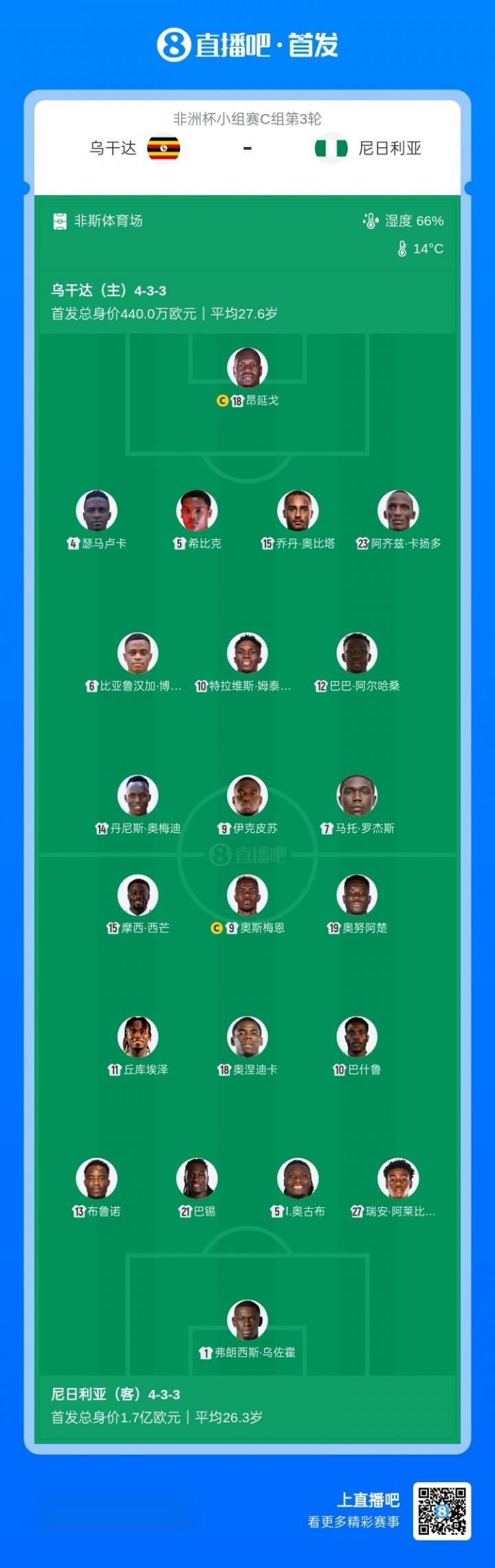 直播吧12月30日讯非洲杯小组赛C组第3轮,乌干达对阵尼日利亚,赛前首发公布。