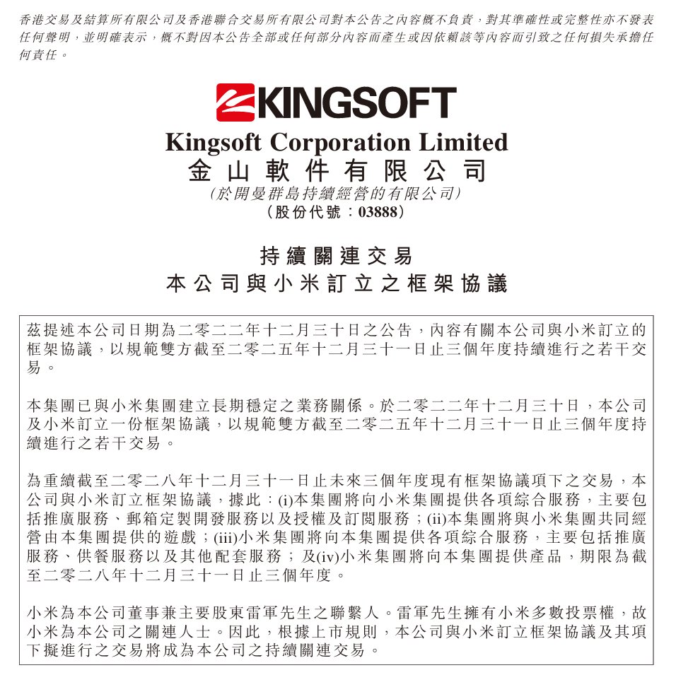 [#金山软件与小米合作关系延续至2028年底#,将采购手机、电视等产品]12月30日消息,金山软件今日发布公告,公司与小米签订新的框架协议,将现有合作关系延续至2028年12月31日。根据协议,金山软件集团将继续向小米集团提供综合服务,包括推广、邮箱定制开发、授权及订阅服务,并共同经营游戏。