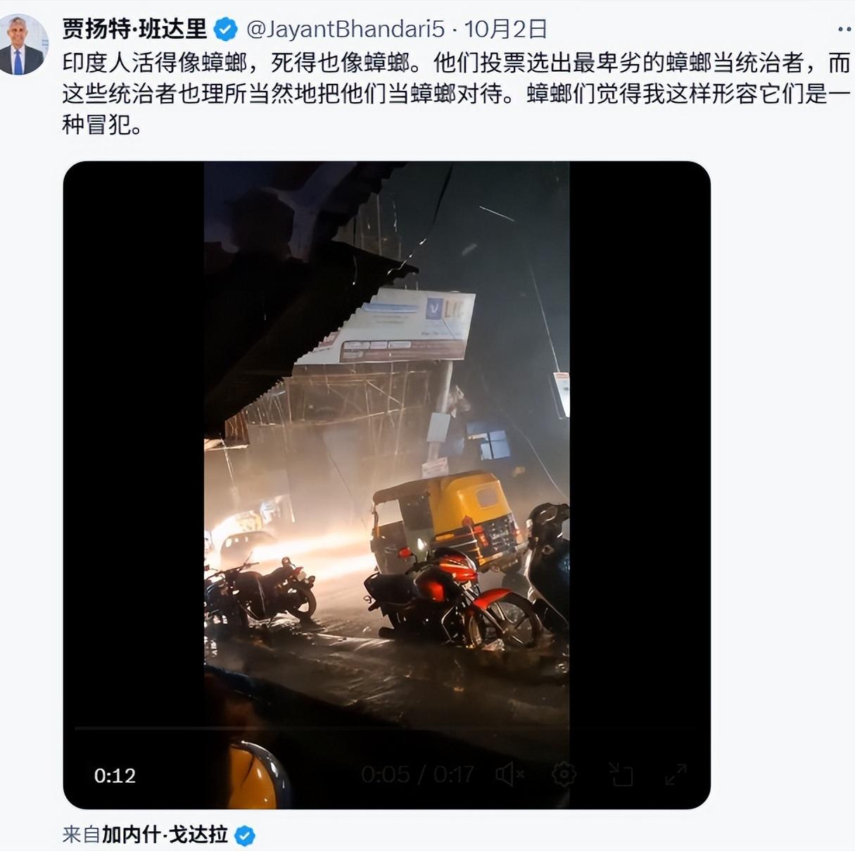 曾被印度背刺的贾扬特·班达里公开讽刺:印度人活得像蟑螂,死得也像蟑螂,他们投票选出最卑劣的蟑螂当统治者,而这些统治者也理所当然地把他们当蟑螂对待。   可能不少朋友看到这话会觉得,这骂得也太狠了点,怎么会有人这么说自己的祖国呢?其实啊,贾扬特说这话不是凭空发泄,背后藏着一段让他彻底心寒的经历。 先说说贾扬特,他早年可是个有头有脸的人物,本身是印度出生,后来去国外深造,拿到了麻省理工的背景,在国际金融圈都是有名的投资顾问,事业做得风生水起。 那时候印度正好掀起经济自由化改革,政府到处招商引资,还把贾扬特当成“海归样本”来宣传,给他发奖章,一个劲儿地拉他回印度投资。 换谁遇到这种情况,都会有点家国情怀吧?贾扬特也不例外,当时就下定决心,带着自己多年攒下的2亿美元回到印度,打算在莫迪的老家古吉拉特邦建一个现代化的物流园区。 这不仅是想光宗耀祖,也确实想为家乡创造点就业岗位,助力国家发展,出发的时候,他肯定是满怀憧憬的,觉得凭着自己的能力和政府的支持,这事准能成。 可理想有多丰满,现实就有多骨感,印度政府当初拉他投资的时候,胸脯拍得震天响,承诺了一大堆税收优惠政策,把前景说得天花乱坠。 结果呢?等到物流园区好不容易建起来,建筑刚封顶的那天,政府送来的不是祝贺,而是一张天价罚单。 贾扬特当时都懵了,园区都还没投产运营,怎么就违规了?后来才明白,这就是明晃晃的索贿,那些官员意思很明确,想少罚点也行,就看你“诚意”够不够。 这还只是开始,更离谱的还在后面。他找的当地合作伙伴,竟然跟管理部门串通起来,弄了三份阴阳合同。 没到一年的时间,贾扬特带来的2亿美元就全打了水漂,等他顺着注册地址去找这个合作伙伴要说法的时候,当场就傻了眼,所谓的公司注册地,竟然是一个农村的烂牛棚。这明摆着就是一场骗局啊。 换作是谁,遇到这种事都得维权吧?贾扬特也一样,他一气之下就把这事告到了法院,本以为法律能还他一个公道,结果法院受理之后,给了他一张传票,但开庭时间竟然定在了2035年。 可当时才2011年,这意味着他得等二十四年才能等到开庭,这哪是维权啊,简直就是把人往绝路上逼。 从那以后,贾扬特就成了印度政府最尖锐的批评者。他在X平台上发表了一大堆批评印度的言论,除了开头咱们说的那句,还说过更狠的。 比如他说印度是“粪坑里的地狱”,给我十亿美金我也不会再回到那里去;还说印度政府里的人都是草包,去政府部门办事,你都会疑惑自己是不是在跟一群真的很愚蠢的人说话,他甚至直言,印度所谓的民主,就是把那些腐败的、心理扭曲的人推到权力的位置上。 现在的贾扬特已经是加拿大公民,在加拿大的米赛斯研究所工作,早就不回印度了,他每天的主要活动,就是在社交媒体上批评印度的各种问题,跟印度网友互怼。 他还经常拿中国和印度做对比,说中国有组织、有纪律、有执行力,做什么事都稳扎稳打,而印度整天就知道争论宗教、种姓这些没用的,国家像一盘散沙。 他说自己在旧金山认识很多中国人,都非常怀念祖国,有强烈的回国愿望,而印度人不一样,只要出了国就再也不想回去,甚至不愿承认自己是印度人。 他的这些言论,在印度引起了很大的争议,很多印度人骂他是“叛徒”,是“国家的耻辱”,在网上对他进行网暴,但也有一部分印度人沉默不语,因为他们心里清楚,贾扬特说的这些问题,在印度确实普遍存在。 其实贾扬特自己也说过,他批评印度不是因为恨,而是因为曾经爱过,是恨铁不成钢,他觉得那些盲目吹捧印度的人,才是真的在害这个国家,用虚假的骄傲麻痹民众,让问题越拖越严重。 现在的他,虽然常年住在国外,但始终没停止过对印度的批评,希望能通过这种方式让更多人看到印度的问题。 不过话说回来,贾扬特的言论虽然尖锐,但也反映出了印度社会的一些深层次问题。比如政府部门腐败、政策朝令夕改、法治体系低效、贫富差距悬殊等等。 这些问题不是一天两天形成的,也不是靠几句批评就能解决的,而贾扬特的经历,也让不少想去印度投资的人敲响了警钟,很多国际企业去印度投资后都吃了亏,所以才有了“印度是跨国企业坟场”的说法。 现在贾扬特依然在X平台上活跃着,继续发表着对印度的批评言论,他的观点可能有些极端,但了解了他的经历之后,也就不难理解他为什么会有这么强烈的情绪了。 毕竟,谁也受不了满怀热情地报效祖国,最后却被如此对待,而他的这些言论,也让更多人看到了印度光鲜外表下的真实困境。 权威信源:贾扬特.班达里X平台发表言论