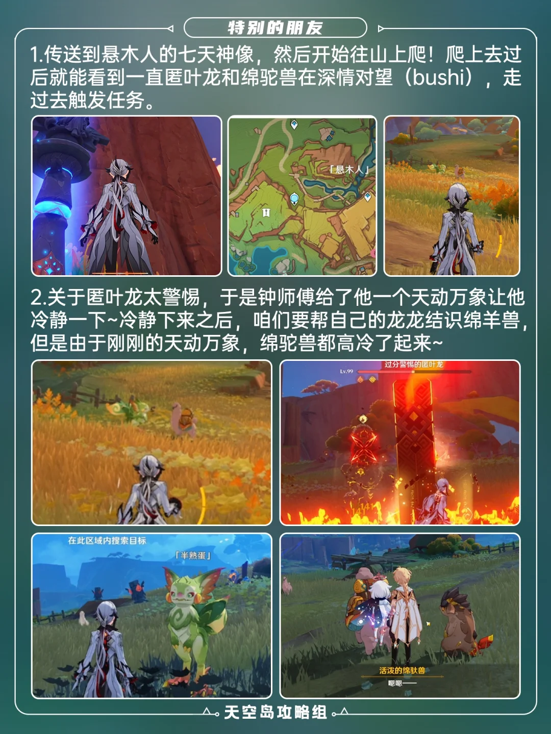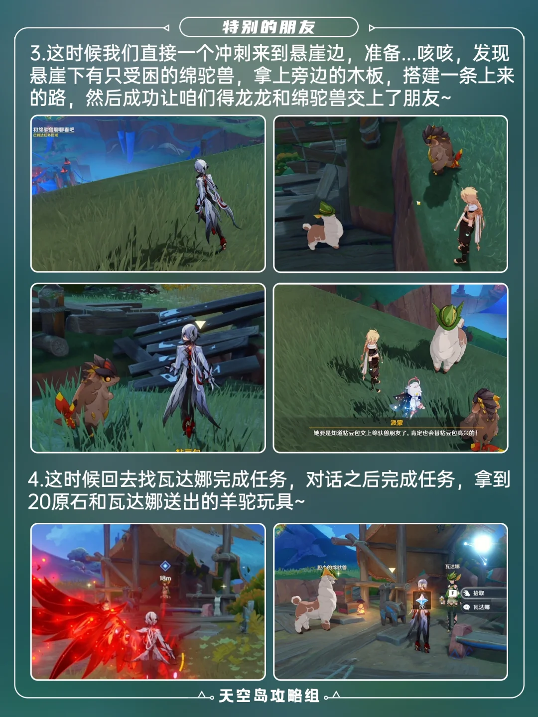可获得20原石+羊驼玩具 1⃣️传送至「悬木人」七天神像,到p2标点 2⃣️注意受困绵驼兽在悬崖下方 3⃣️回去找瓦达娜对话完成任务,拿到20原石和羊驼玩具